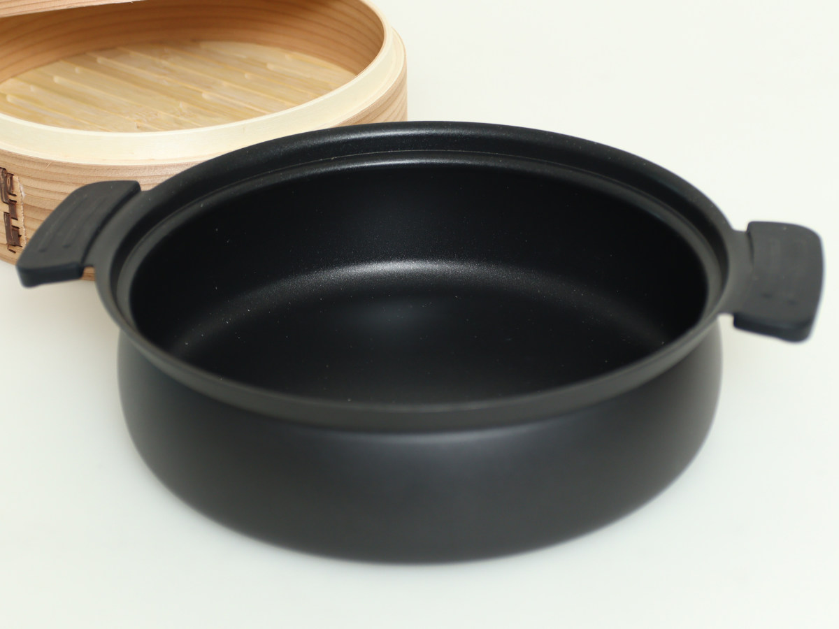 | 材質 | 本体:アルミニウム合金 (表面加工/内面:ふっ素樹脂塗膜加工、外面:焼付け塗装) はり底:ステンレス鋼(クロム16%) ハンドルカバー:シリコーンゴム フタ:アルミニウム合金 つまみ:フェノール樹脂 |