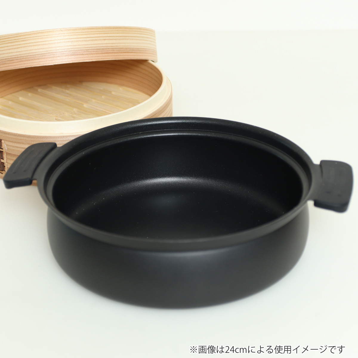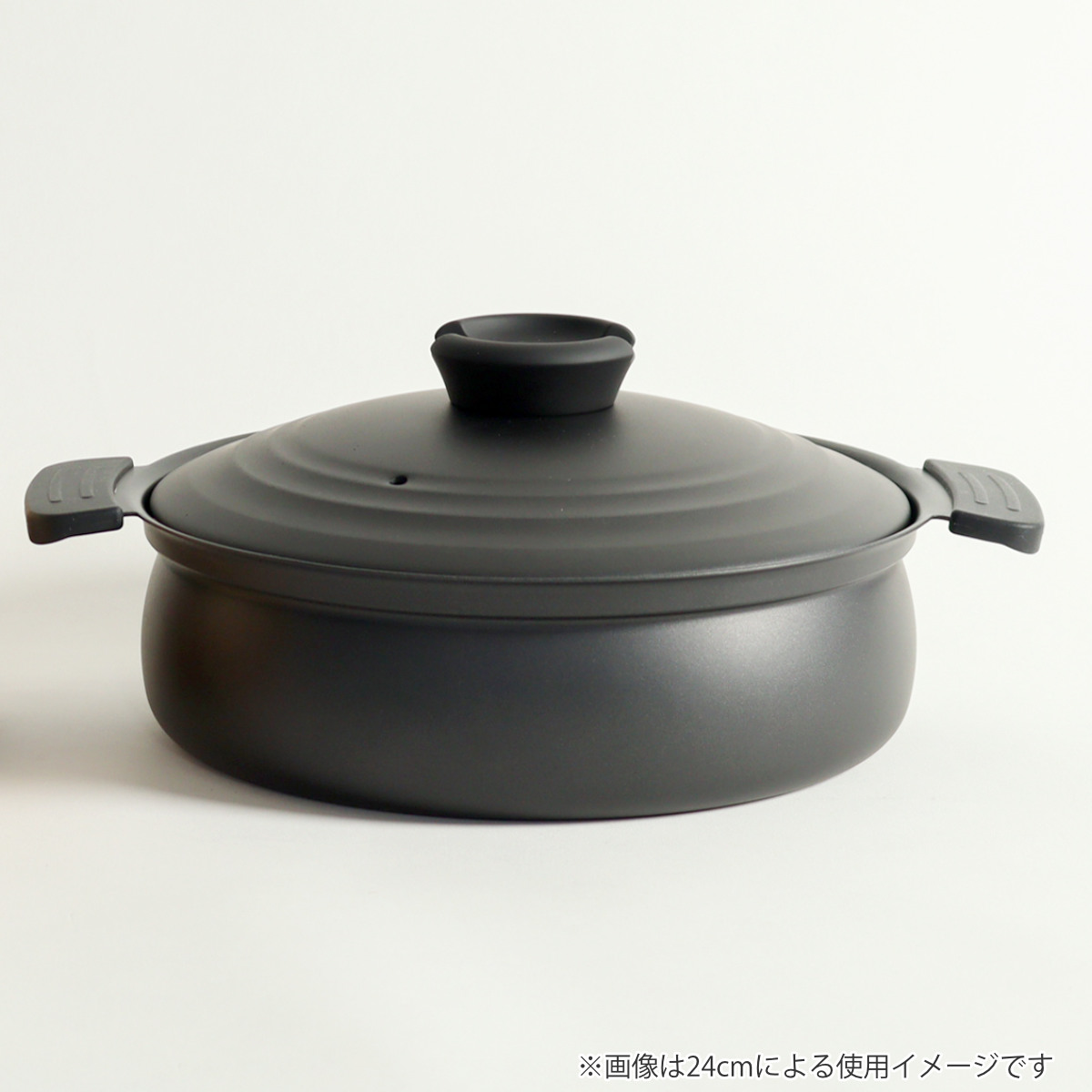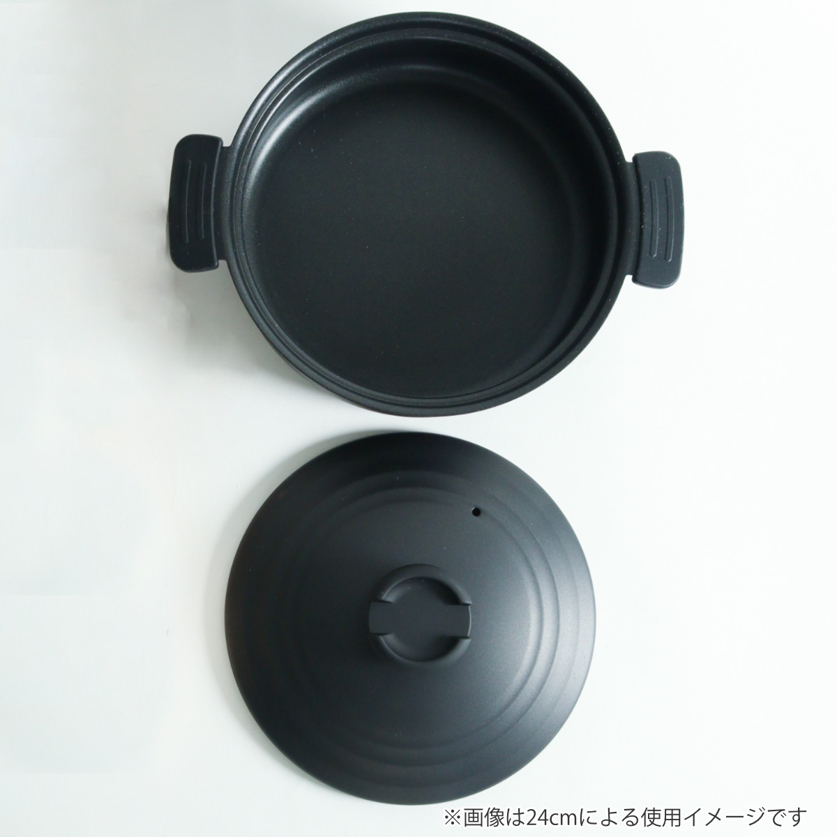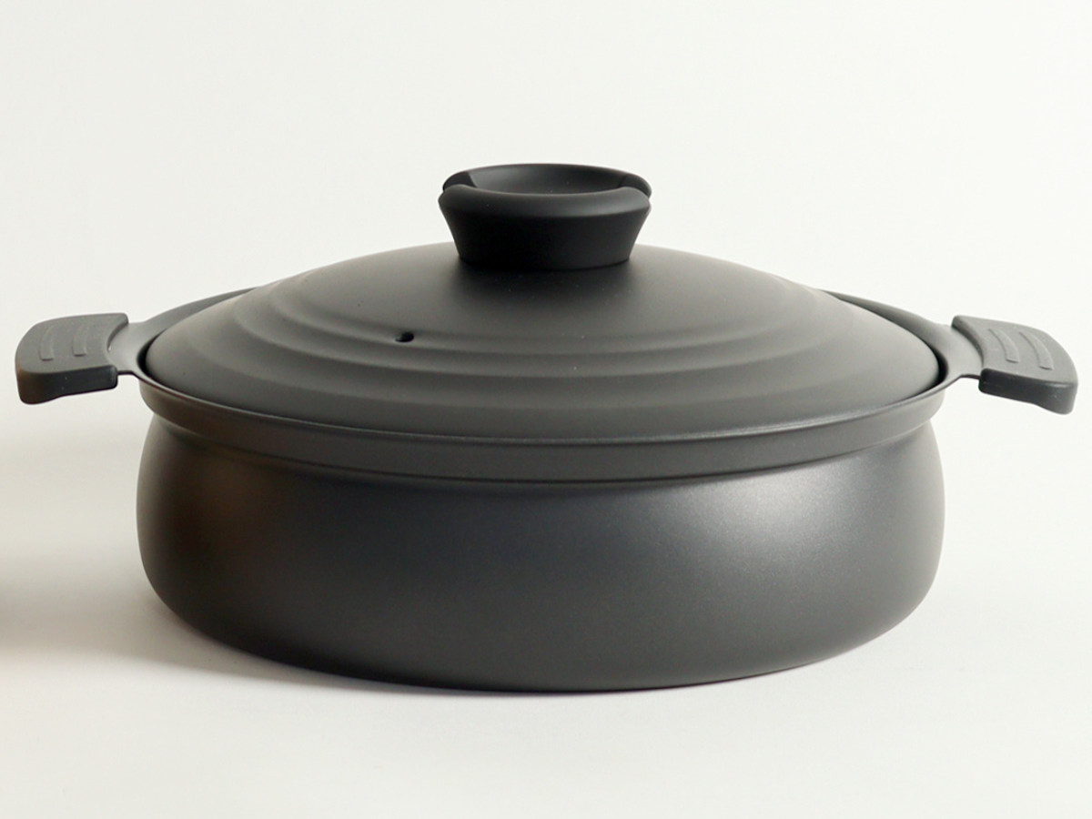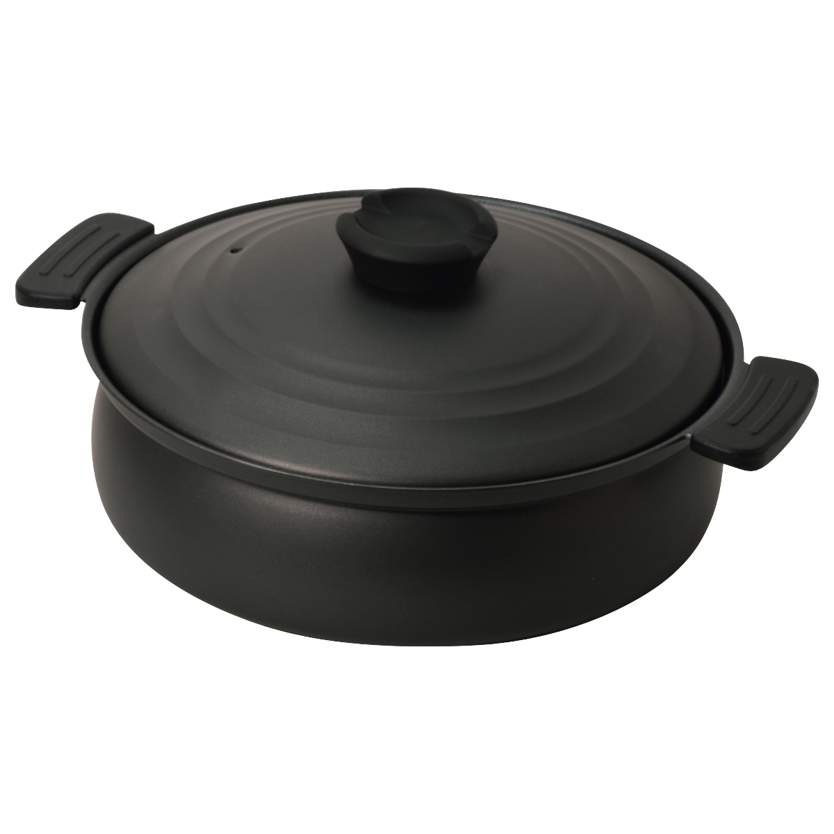 シックなブラックカラーが魅力的な、フッ素加工の卓上鍋です。4~5人分の料理にちょうどいいサイズで、雑炊やしゃぶしゃぶ、キムチ鍋など、様々な鍋料理に活躍します。IH・ガス火どちらにも使えます。