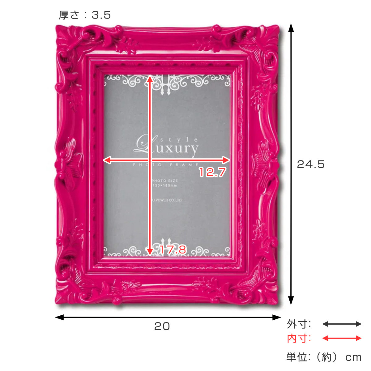 | サイズ | 約 幅20×高さ24.5(cm) フレーム厚さ:約 3.5(cm) 対応写真サイズ:2L判 |