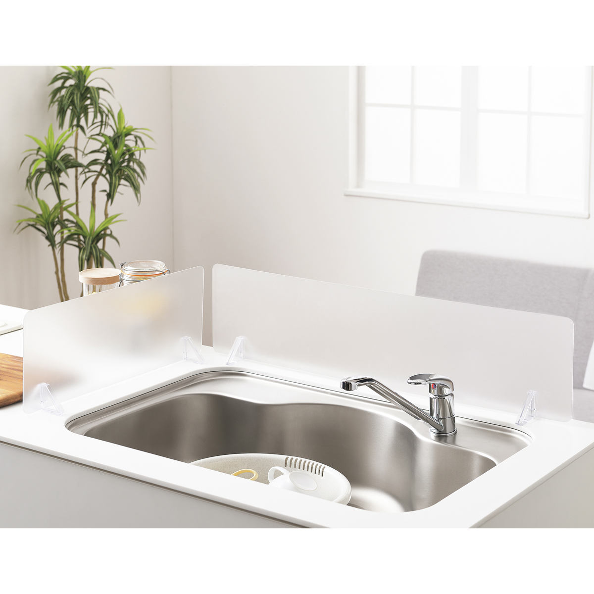 対面式やアイランド式キッチンでのシンクの水はね、洗剤の飛び散りを防止するパネルです。シンクを使っていると必ず出てしまう水はねや洗剤の飛び散りを防ぐことができるので、毎日の洗い物も気楽にできます。リビング側から気になるシンク周りの目隠しとしても役立ちます。