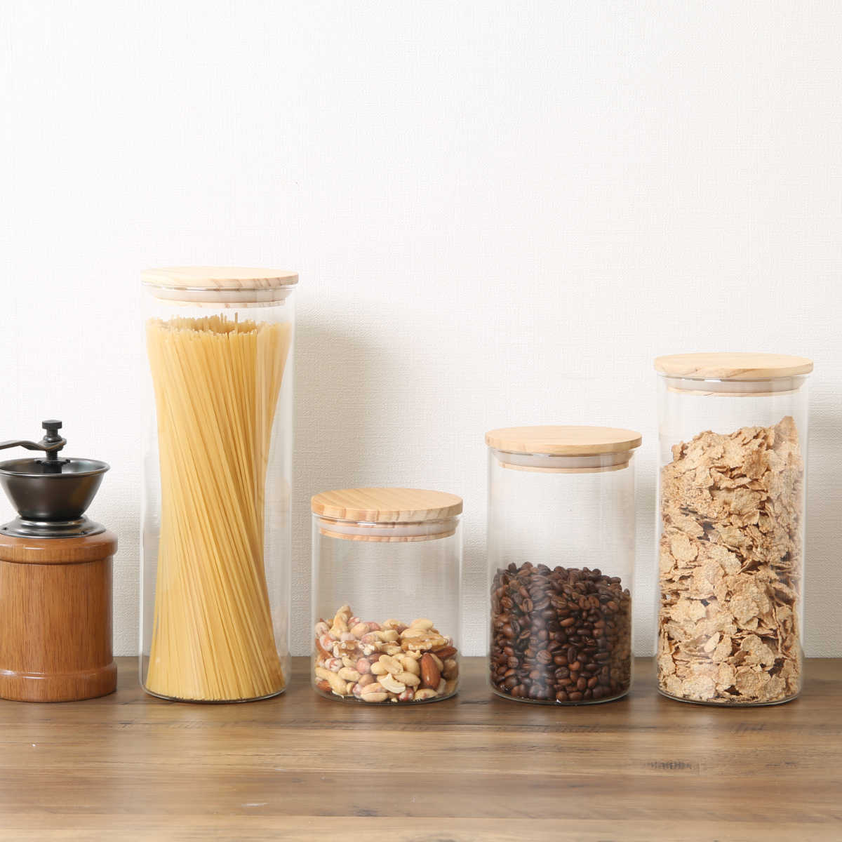 木蓋がおしゃれなガラスキャニスターです。ナッツ類やパスタ、シリアル、昆布、コーヒー豆などの乾物の保存に最適です。食品を入れるのはもちろん、綿棒やコットンなどの小物を入れて、見せる収納としても使えます。残量の確認もしやすく、詰め替えのタイミングが分かりやすいです。ガラス製でにおいや色もつきにくく、汚れも落ちやすいのもポイントです。