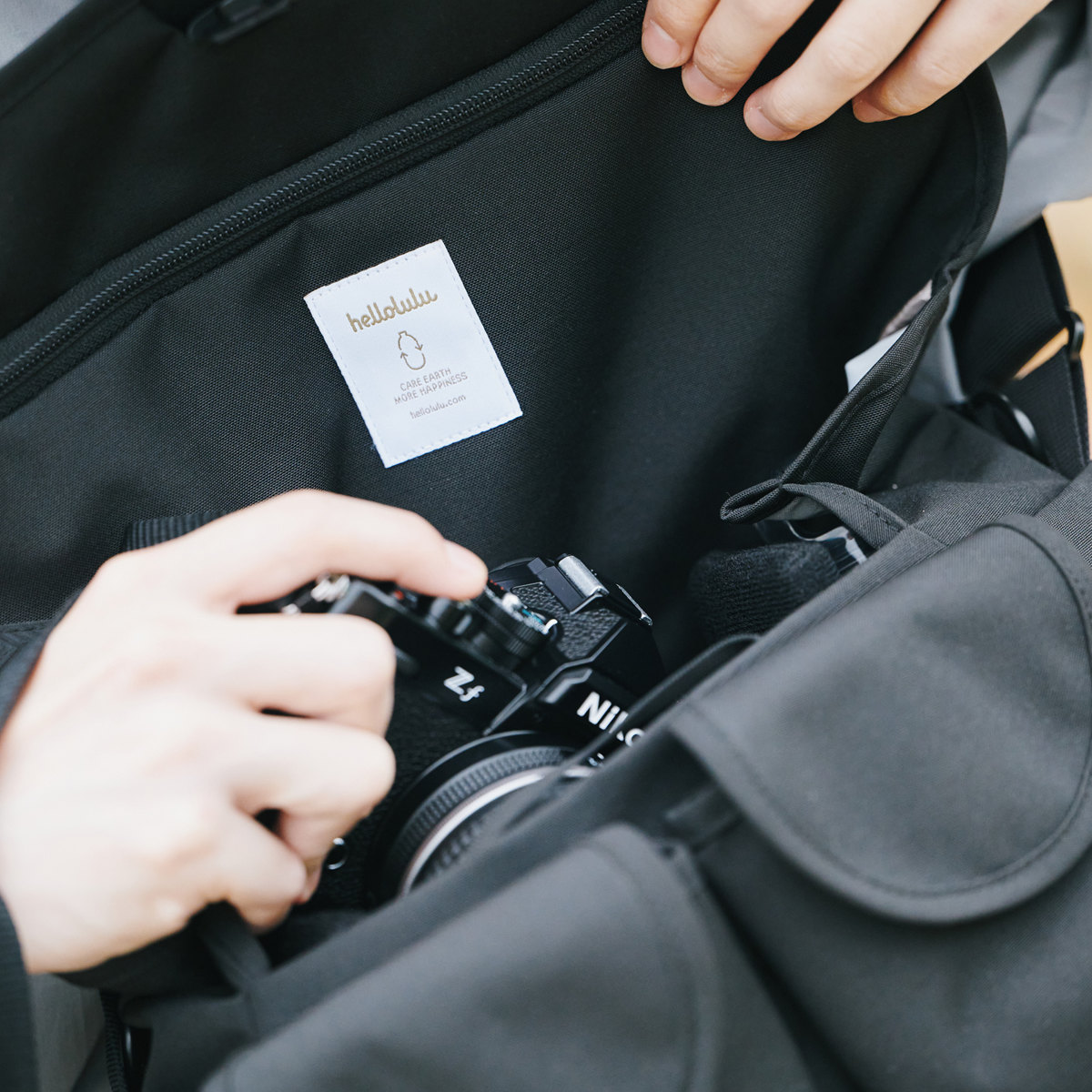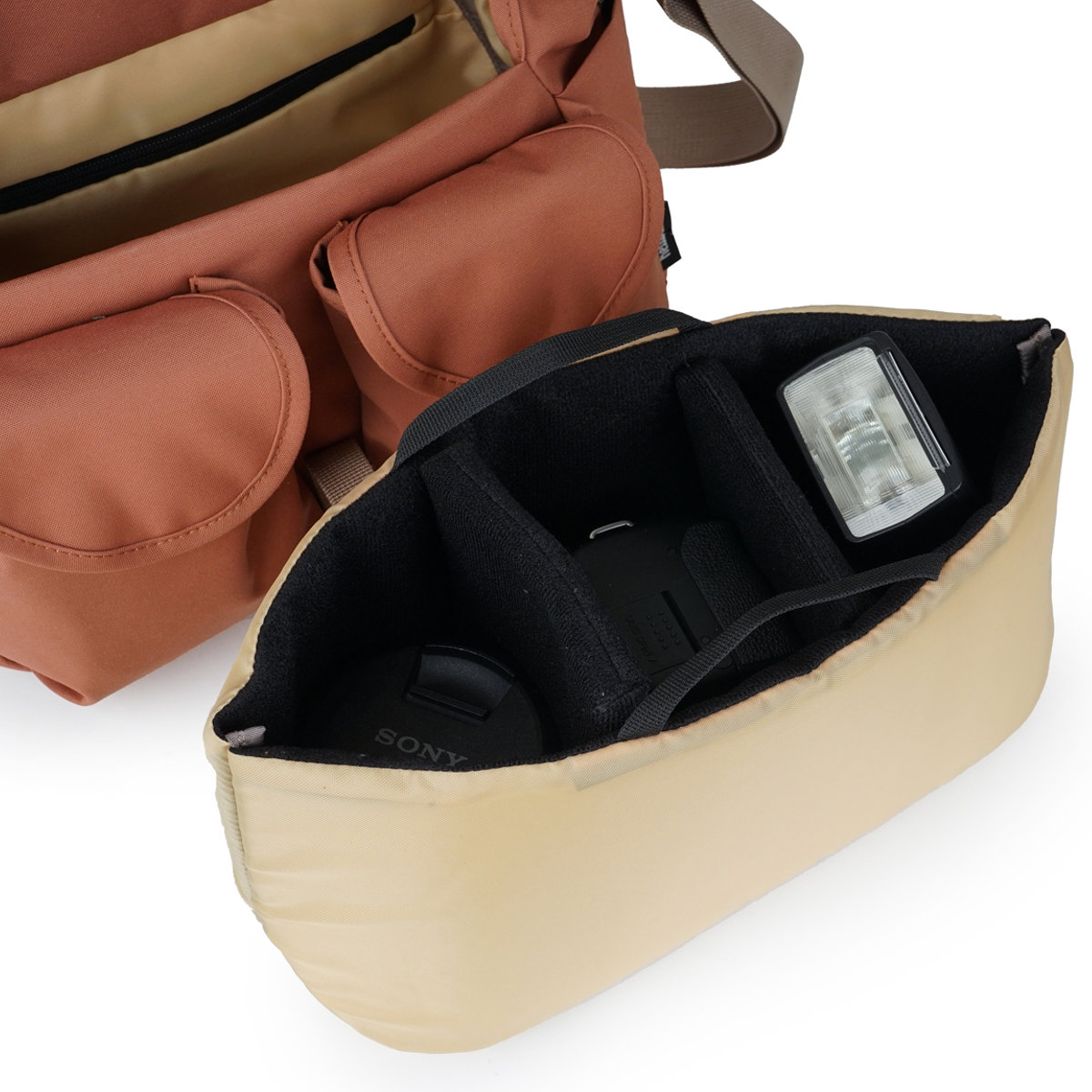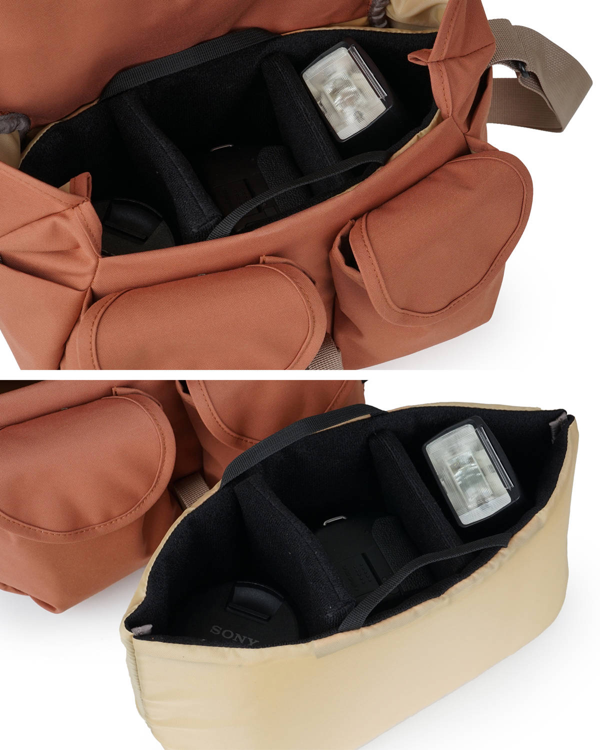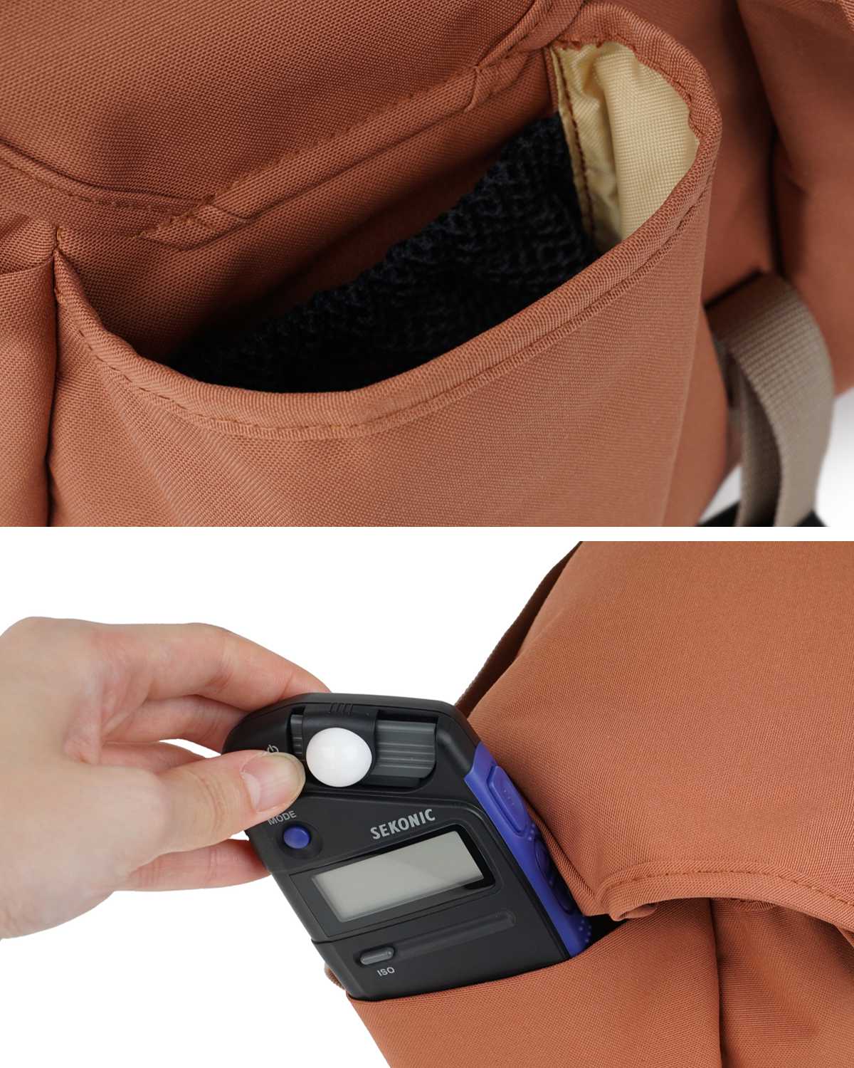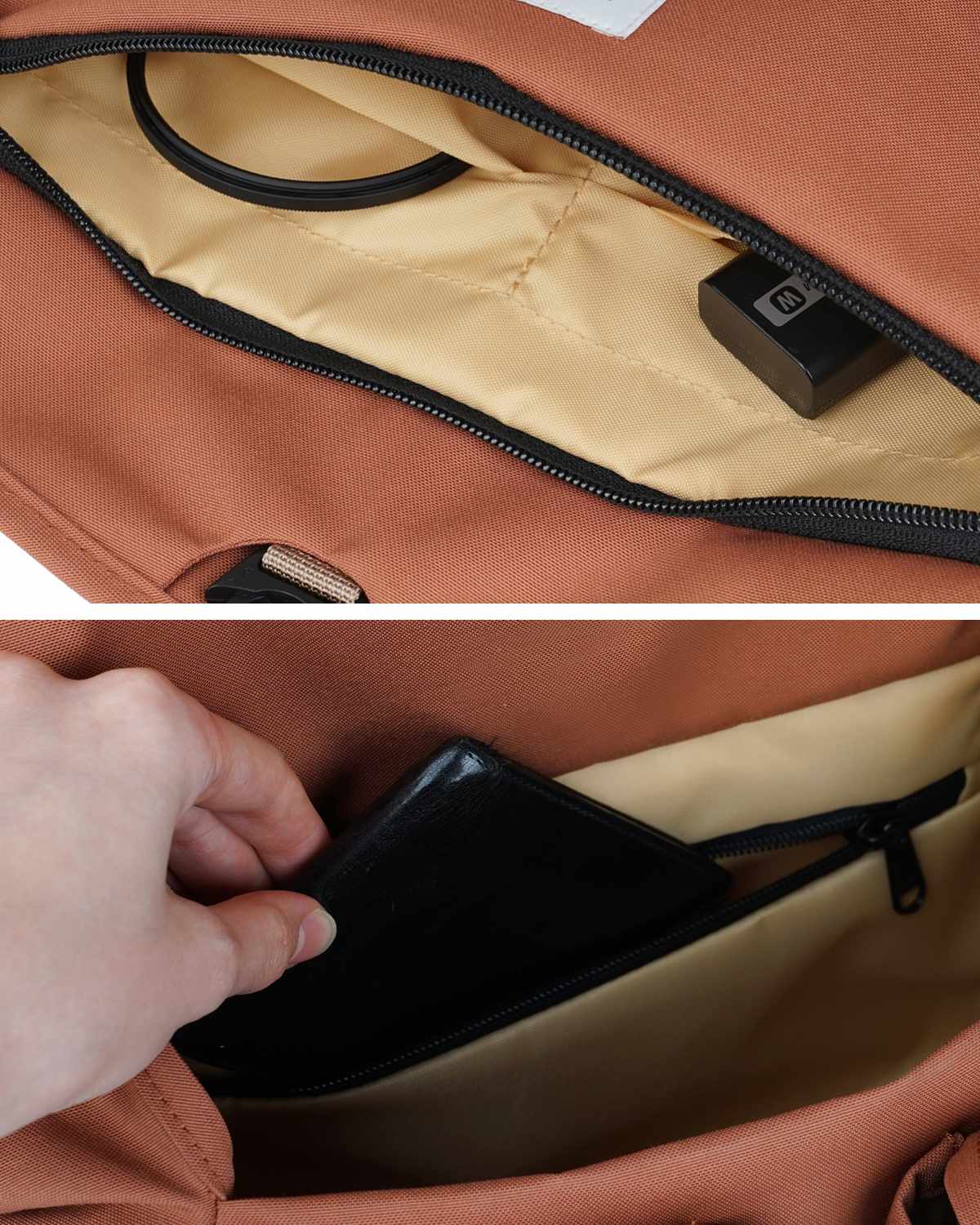 フラップ部分とメイン収納の内側にはファスナーポケットが付いています。予備のレンズや小物類の収納にぴったりです。