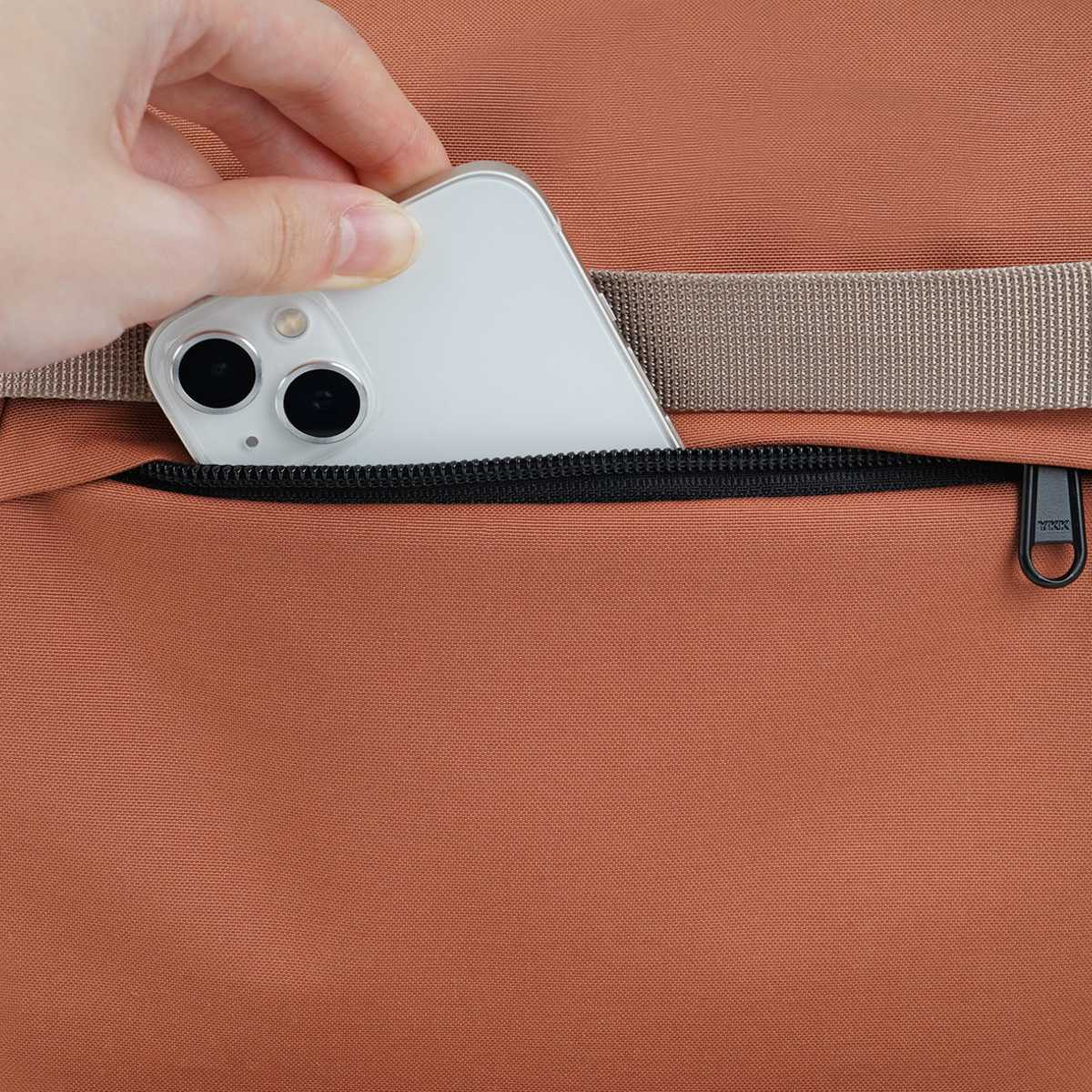 背面にもファスナーポケットが付いているので、携帯などを入れておけばサッと取り出せて便利です。
