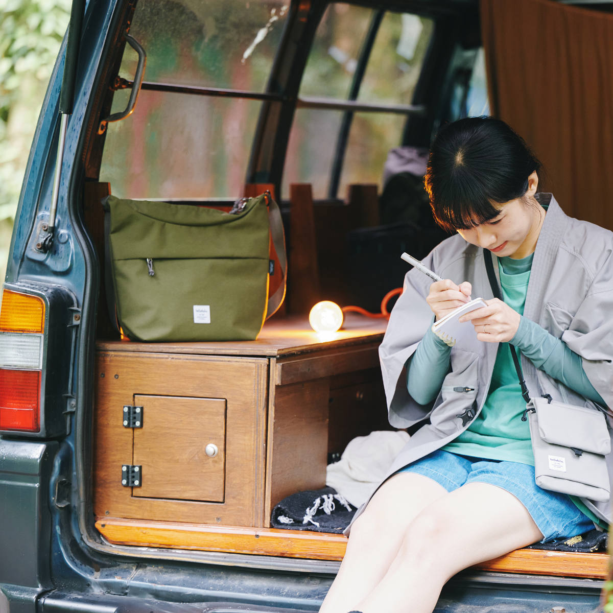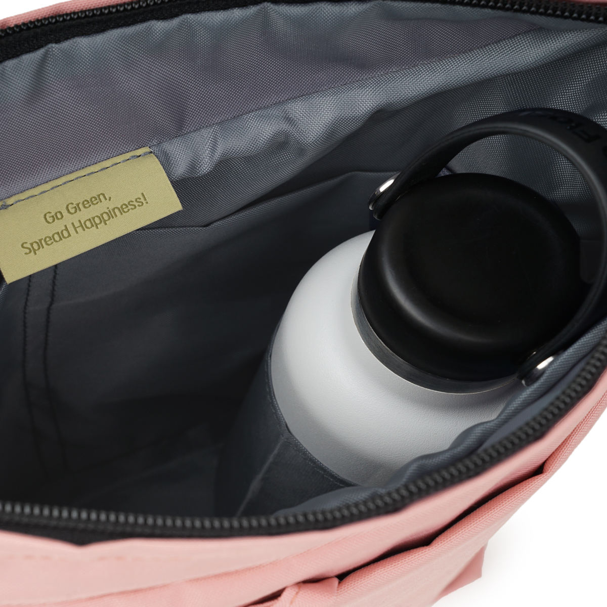 リサイクルしたポリエステル素材を使用しており、軽量で使いやすいだけでなく環境にも優しいアイテムです。撥水加工が施されているので、アウトドアにもおすすめです。