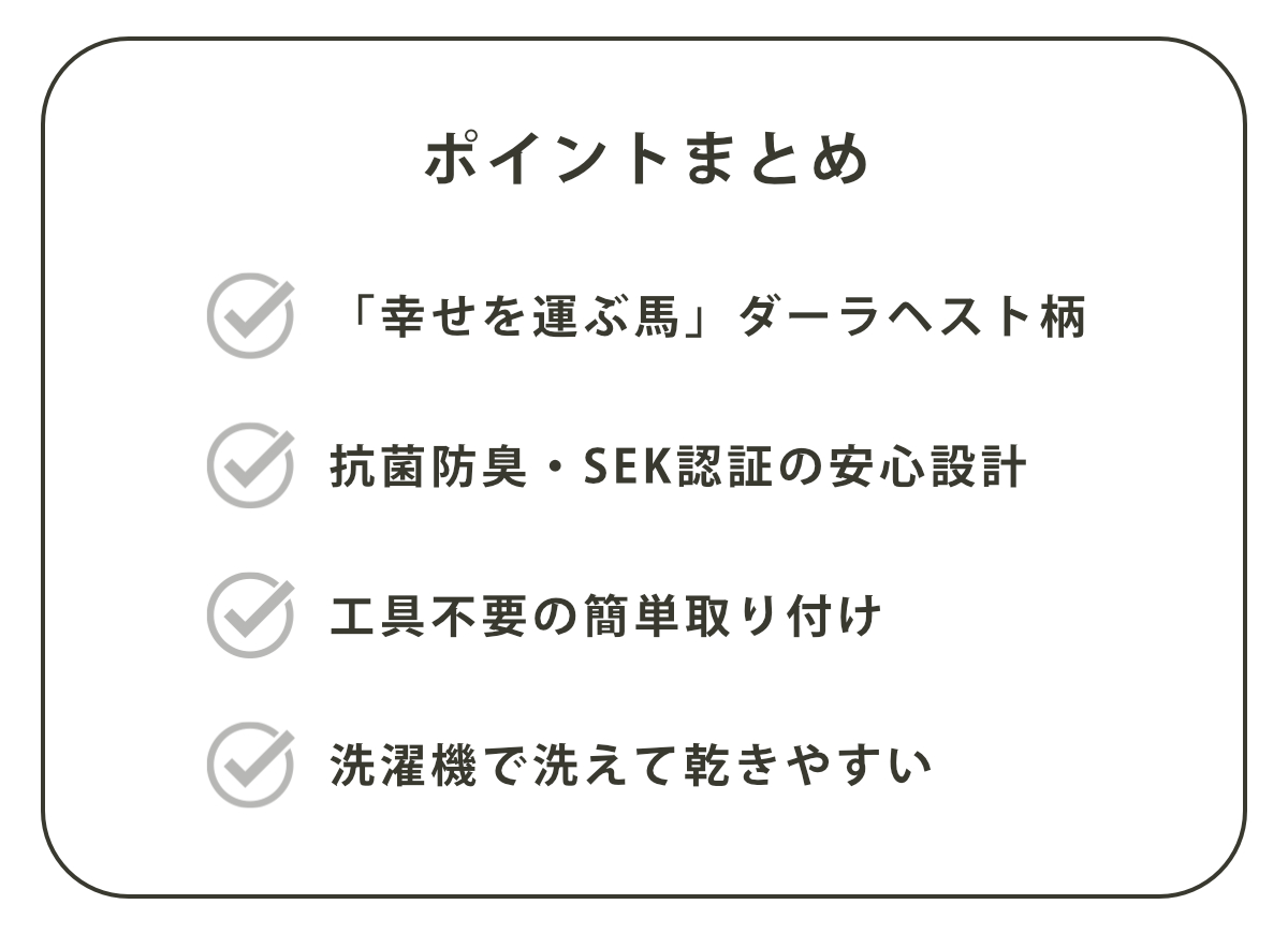 幸せを運んでくれる馬として世界中の人々に親しまれている、ダーラヘスト柄の蓋カバーです。1949年にスウェーデンで設立されたテキスタイルメーカー「ARVIDSSONS TEXTIL(アルビッドソンズ)」の生地を使用しています。洗浄・暖房機能付きのトイレに対応した仕様です。
