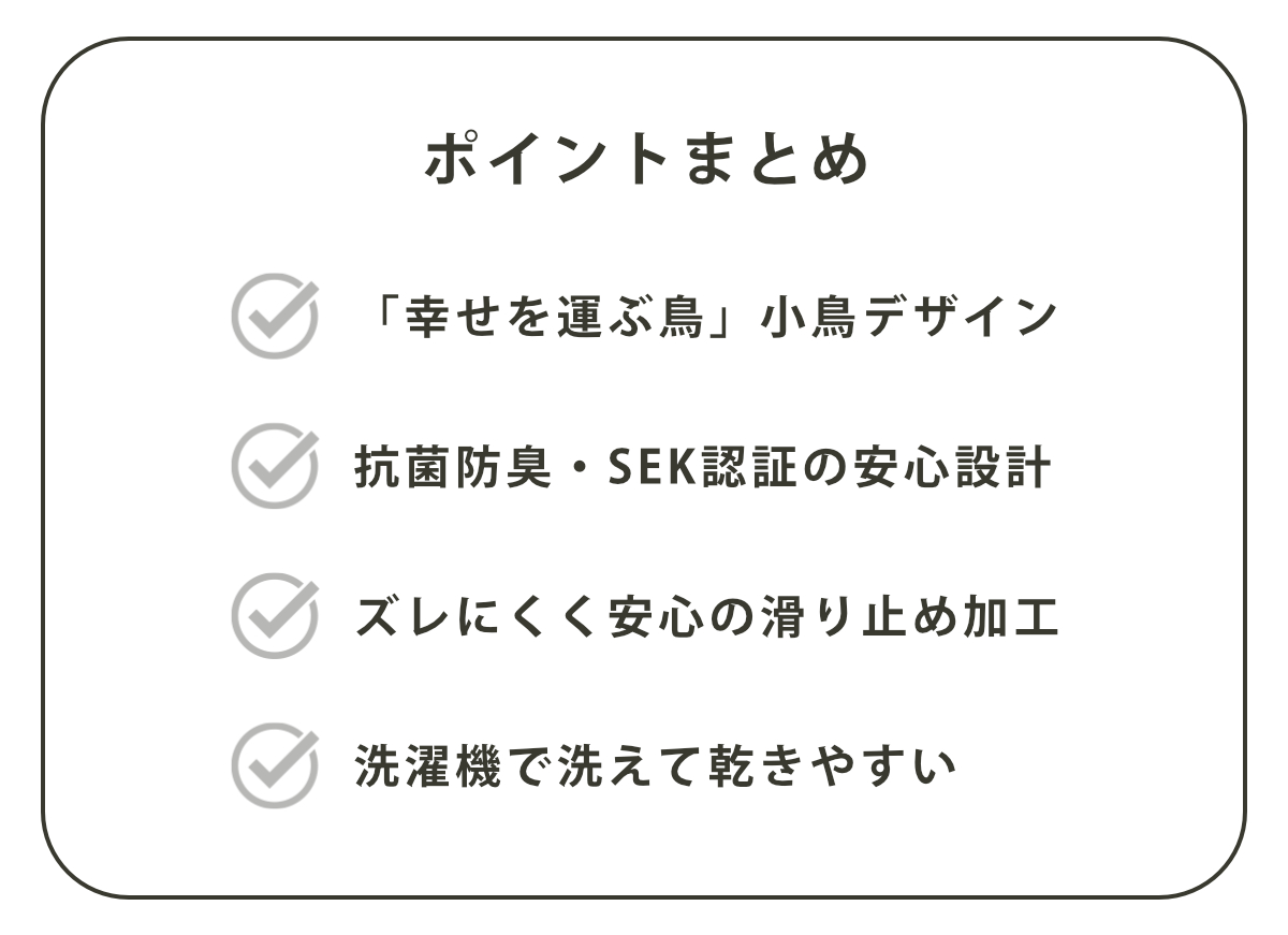 北欧フィンランドにあるSTUDIO HILLA(スタジオヒッラ)がデザインした生地を使用したトイレマット90×70cmです。古くから鳥が幸せを運んでくるという言い伝えをもとに生まれた、小鳥モチーフのデザインをあしらっています。派手すぎず空間を明るく彩り、トイレの奥までしっかりとカバーでき、さまざまなトイレ空間に取り入れやすいサイズです。