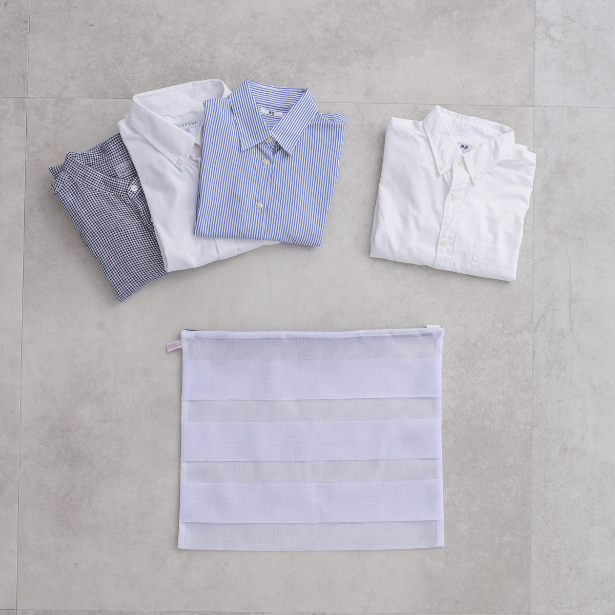 片側にプリーツを設けた構造で、洗濯物を入れるとプリーツ部分が自然に広がります。見た目はコンパクトでも、一般的な洗濯ネットに比べて約1.5倍の洗濯物が入る大容量設計です。