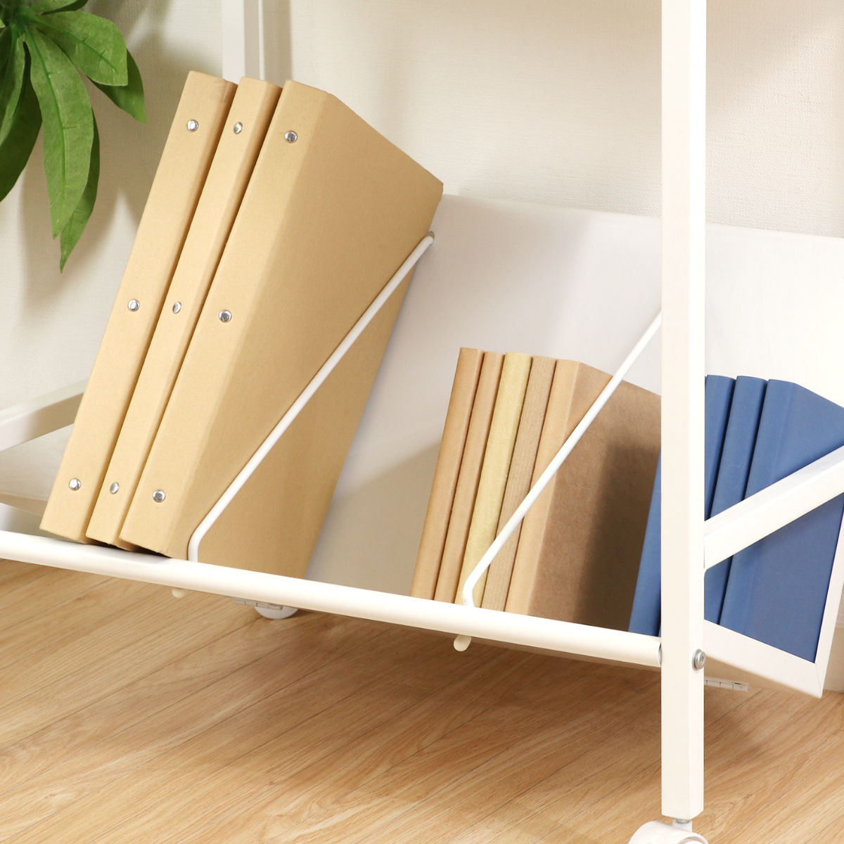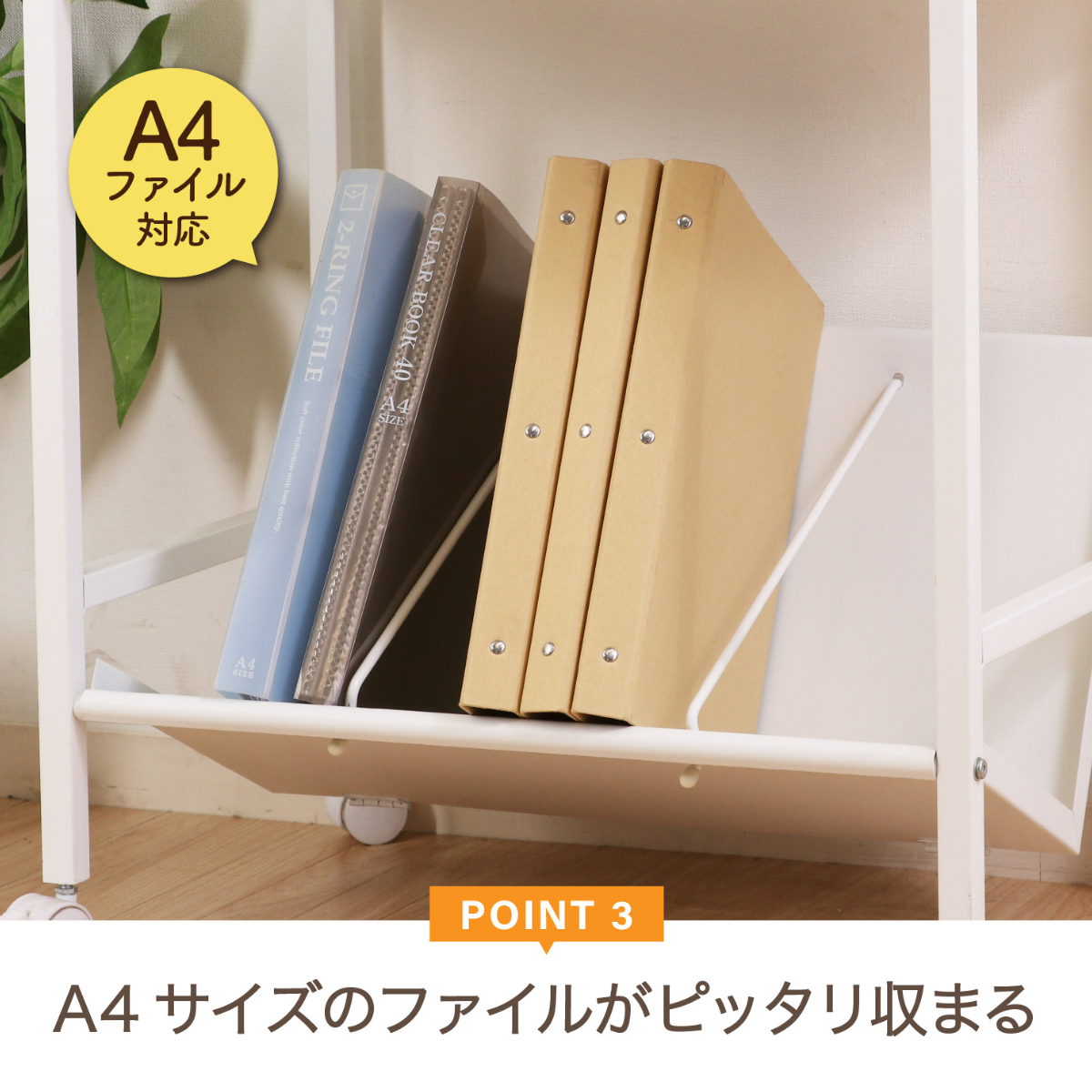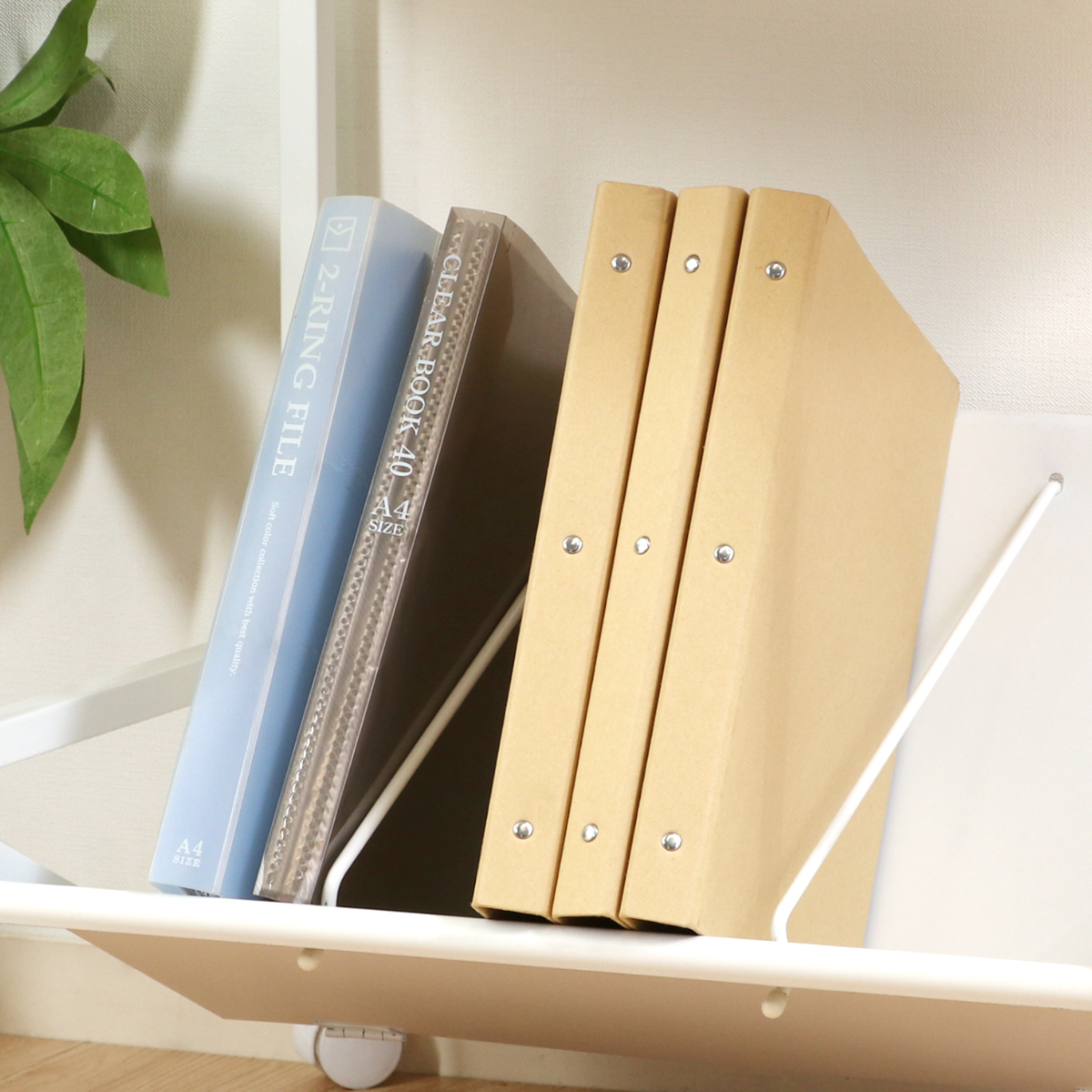 収納する棚自体が斜めの構造なので、背表紙が見やすく書類の出し入れも簡単です。また、A4サイズのファイルも棚からはみ出ることなくすっぽり収まります。