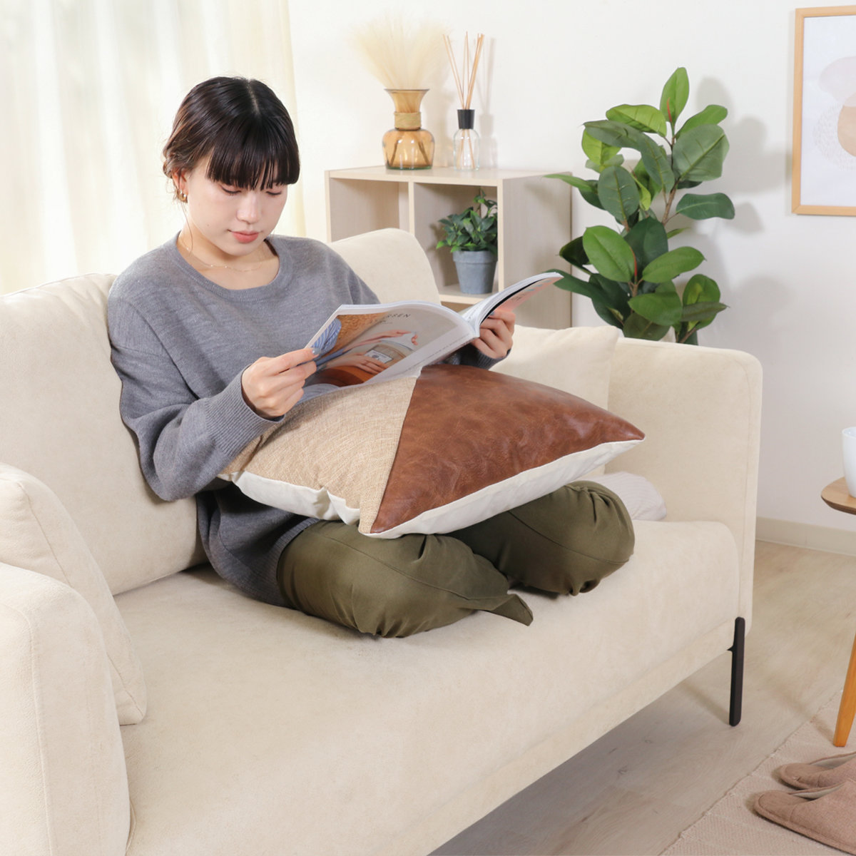 腕をゆったり預けてリラックスできます。横向きではしっかりとした背もたれになります。クッションも2個付属していて快適にお使いいただけます。