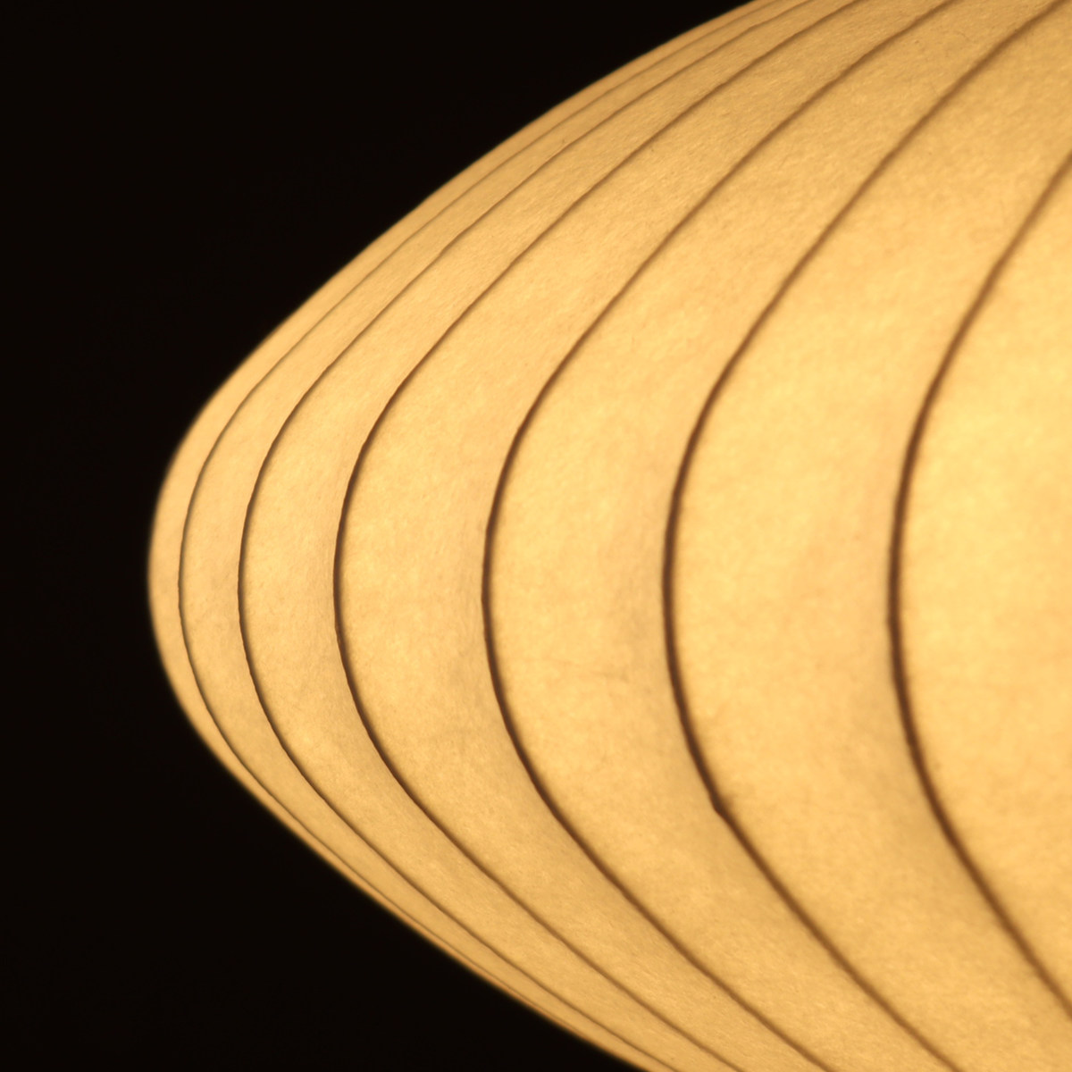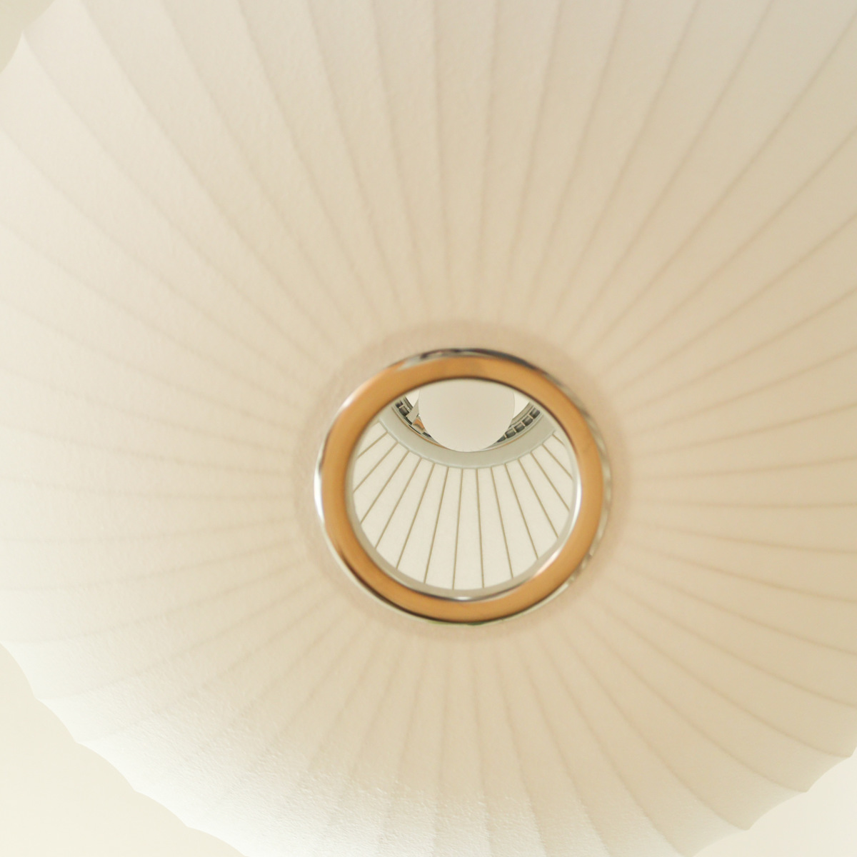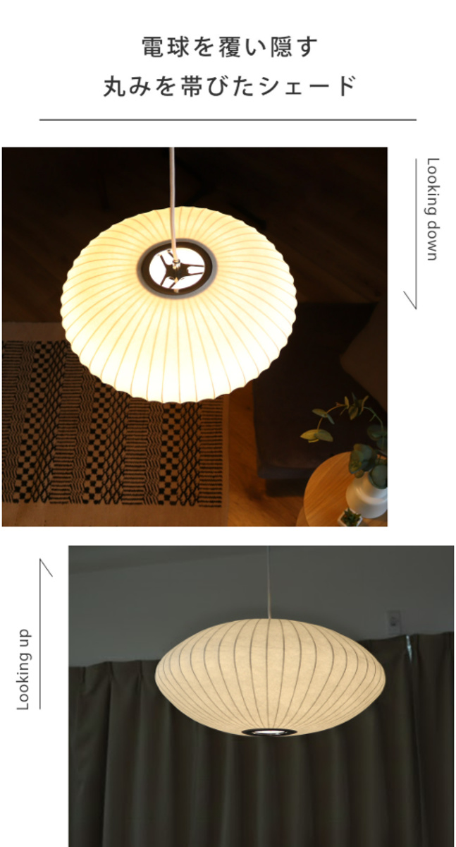 シェードから電球の明かりがやさしく透け、空間全体をやさしく照らします。光源が直接目に入らないので、眩しさも軽減されます。