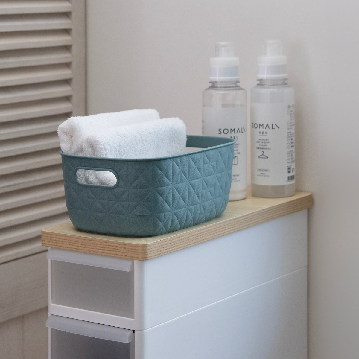心地よい感触とやわらかな質感が特徴のキルト調バスケットです。三角形と四角い格子を組み合わせた表面の凹凸が、キルト生地のような独特のふっくらとしたやわらかな質感を生み出します。