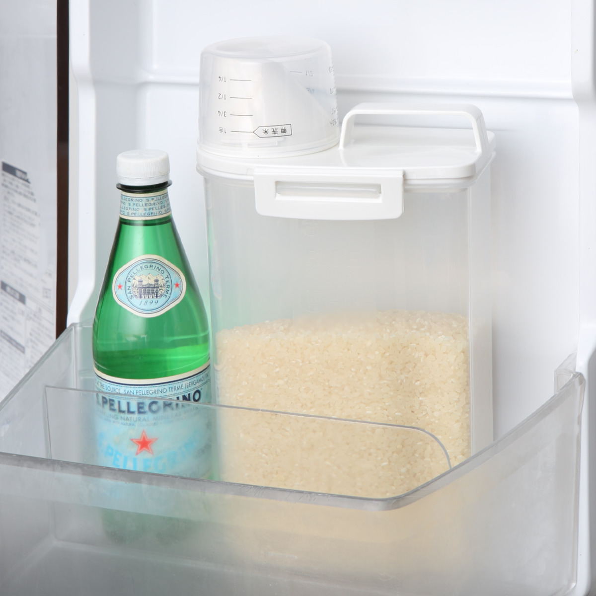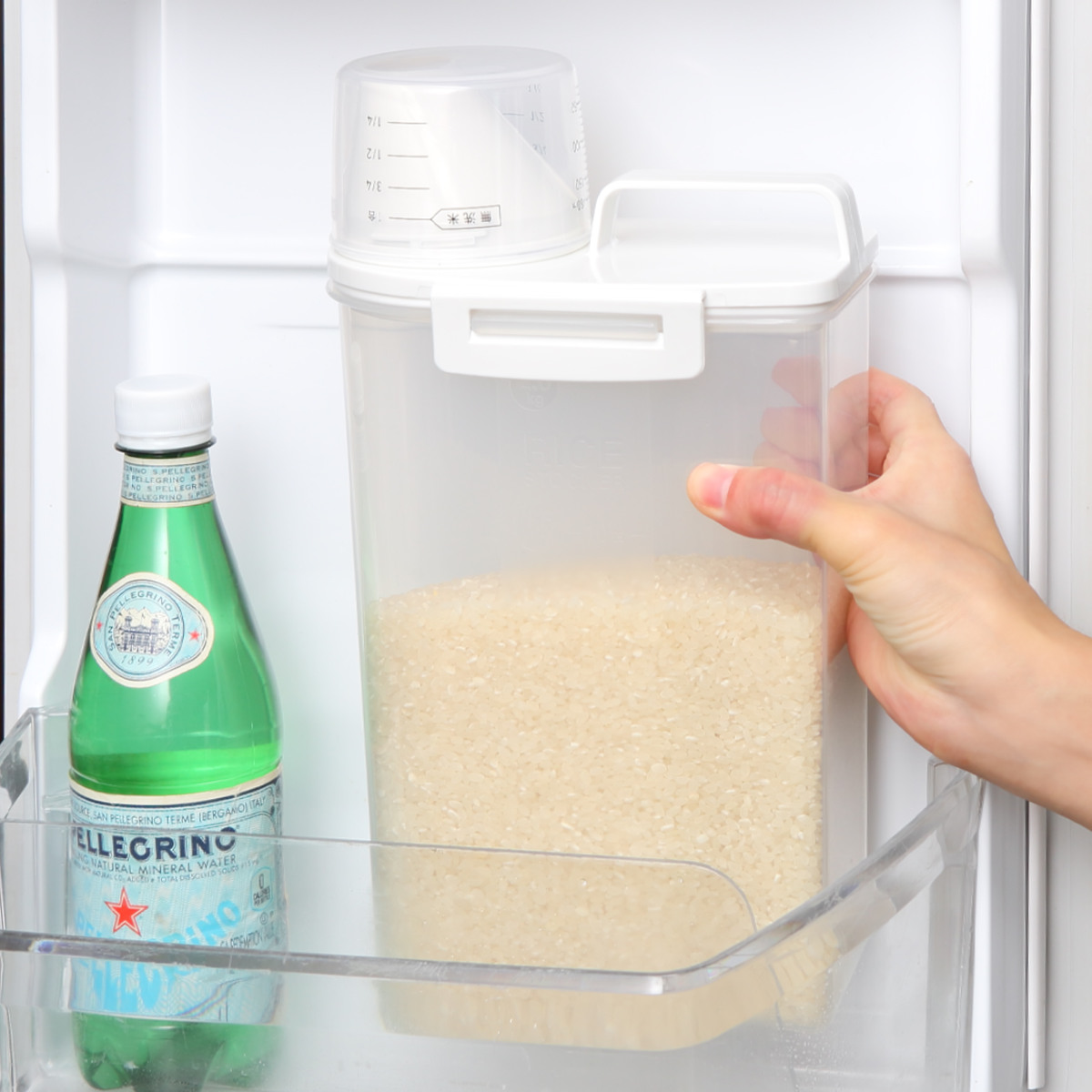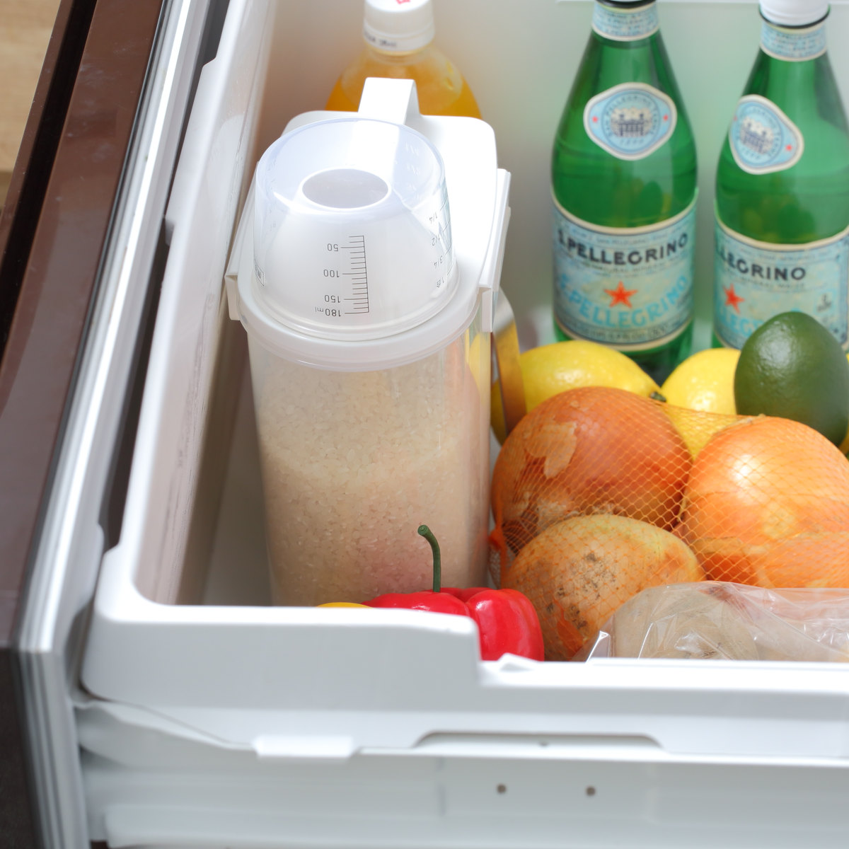 冷蔵庫のドアポケットに入れるのはもちろん、米びつを横にして入れることもできます。野菜室での保存もできるので冷蔵庫の状況によって使い分けられます。
