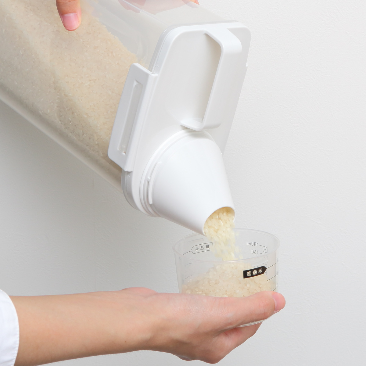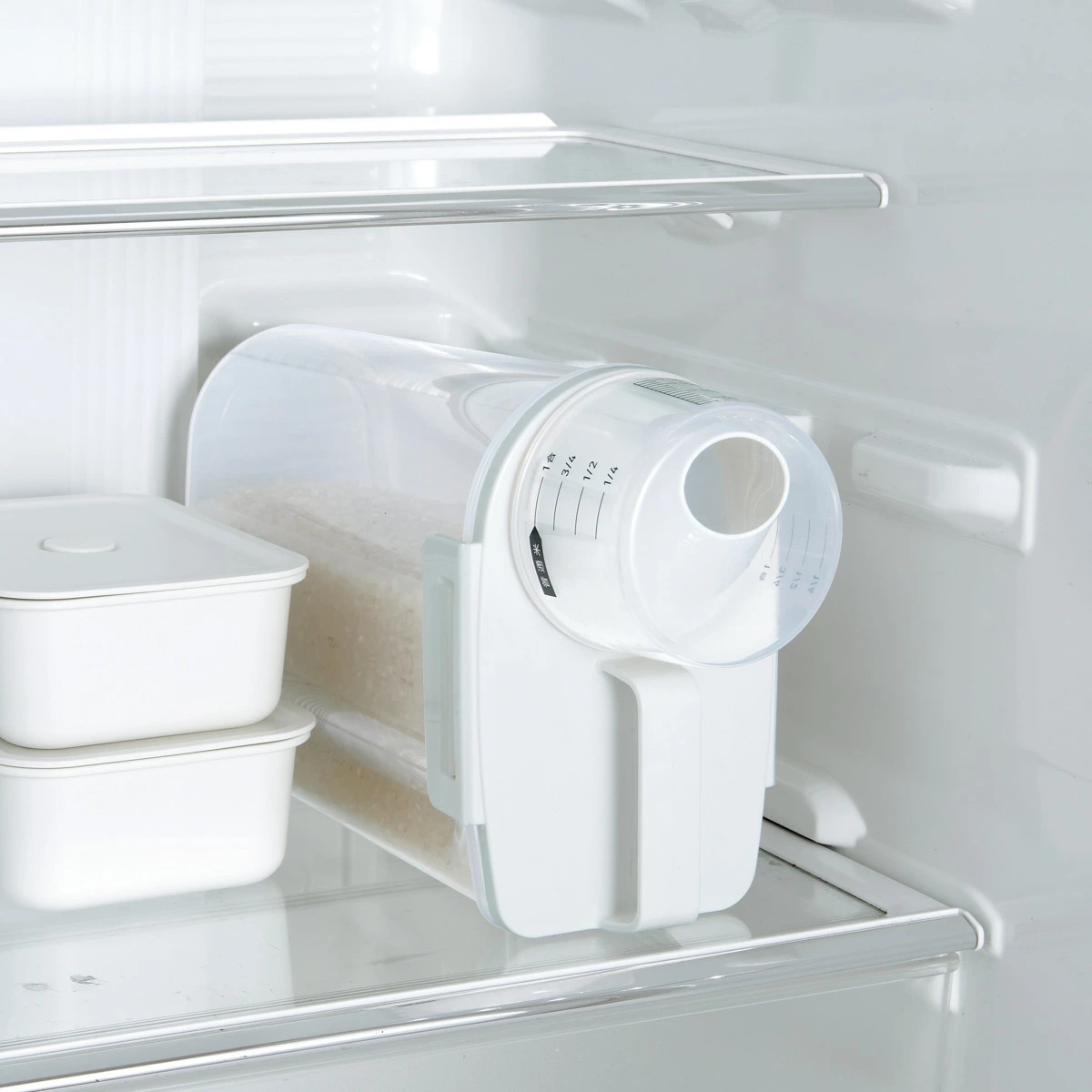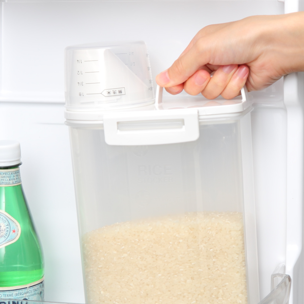 フタは目盛りがついているので、冷蔵庫から取り出してフタを開ければすぐに計量できます。また、普通米だけでなく無洗米も計量が可能です。