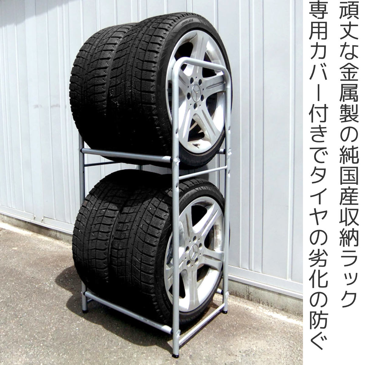 タイヤラック カバー付き 2way 固定式 屋外 縦置き ( タイヤ 収納 4本 保管 ラック 幅56.5cm 頑丈 日本製 高さ調節 外径73cm以内 タイヤスタンド 劣化防止 スタッドレス タイヤ収納 タイヤ保管 カバー 長持ち ホコリ 対策 雨除け )