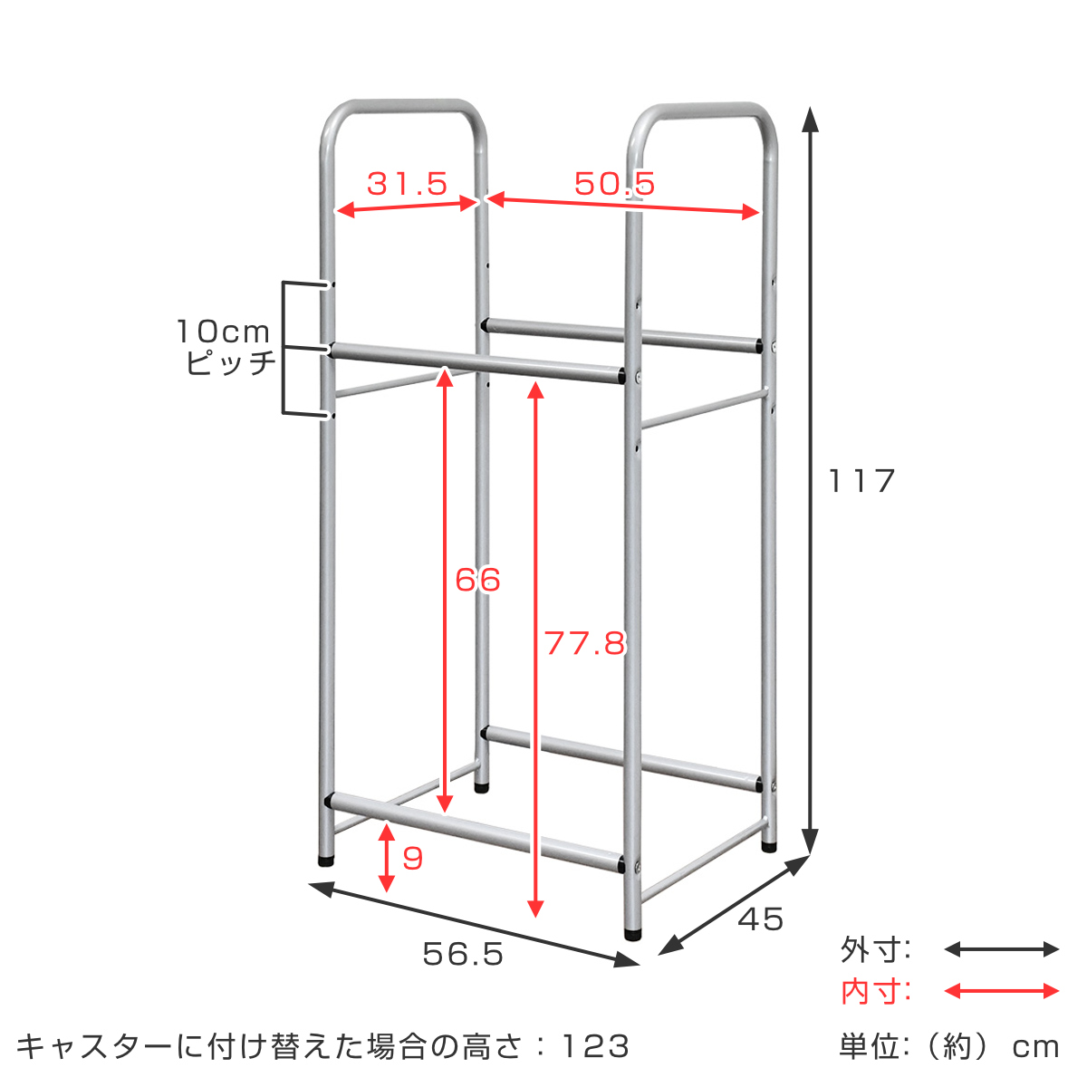 | サイズ | キャスター使用時:約 幅56.5×奥行46×高さ123(cm) アジャスター使用時:約 幅56.5×奥行45×高さ117(cm) 収納内寸:約 幅50.5cm(タイヤ幅サイズ約 25cm以内) |