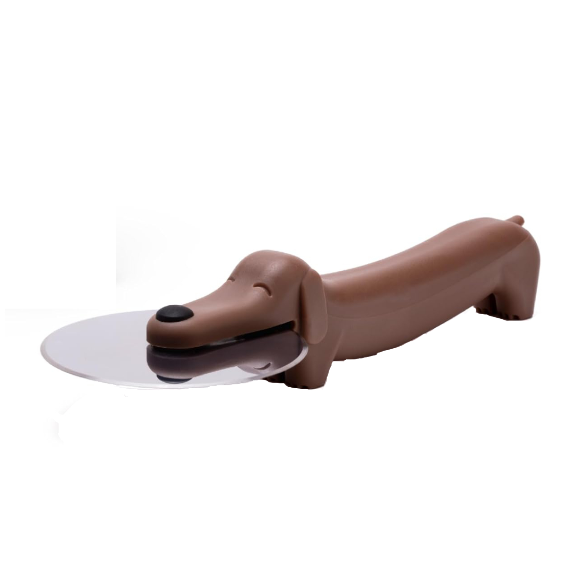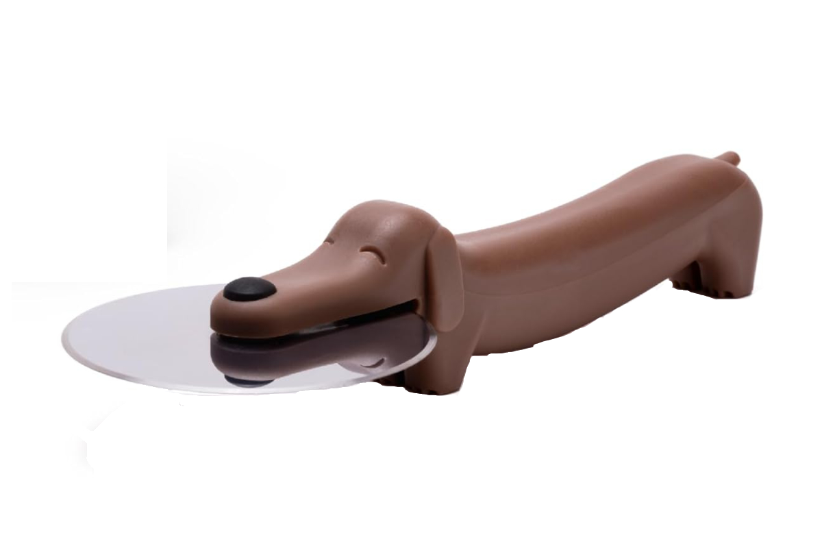 フリスビーをくわえた姿に見えるキュートなピザカッター。短い足で自立してくれるので、机を汚さずに置けます。