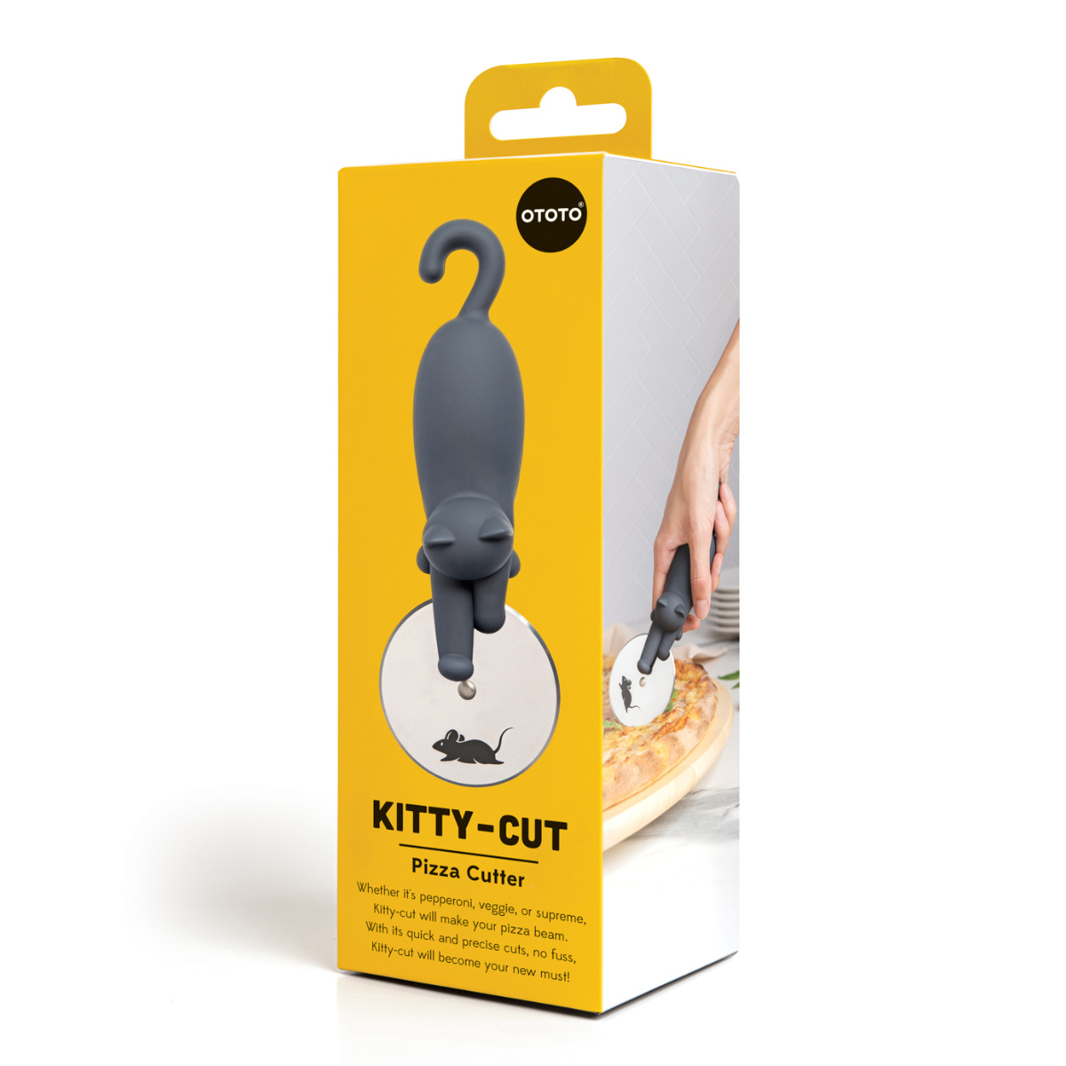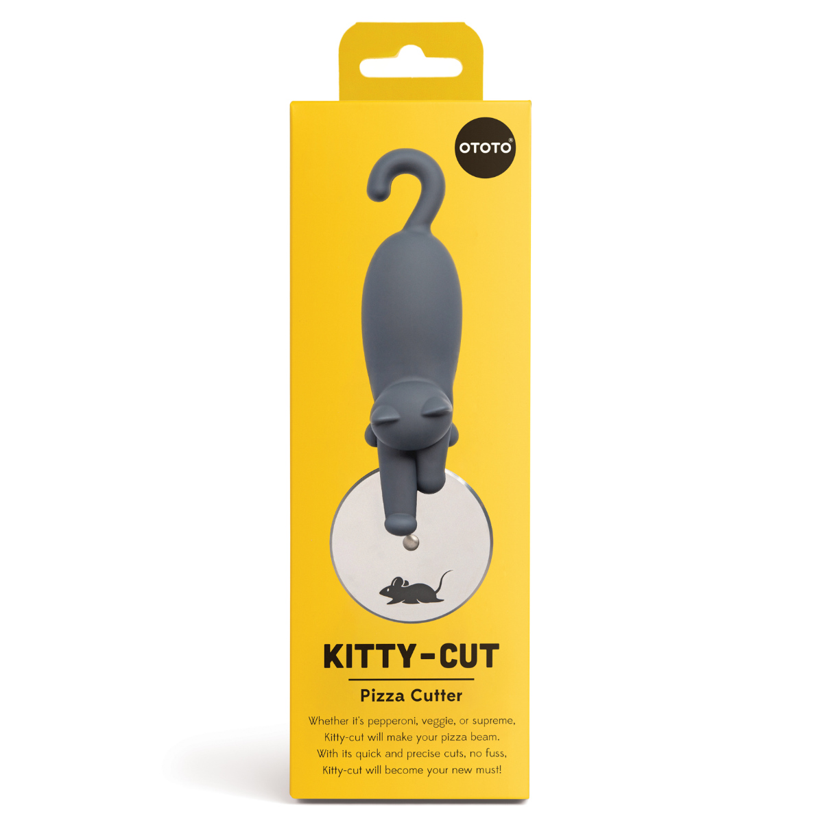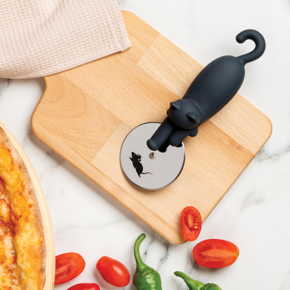 カッター部分にネズミがプリントされており、コロコロ転がすと、まるで追いかけっこをしてるような、とてもユニークな猫のピザカッターです。猫とピザ好きにはたまらない逸品です。