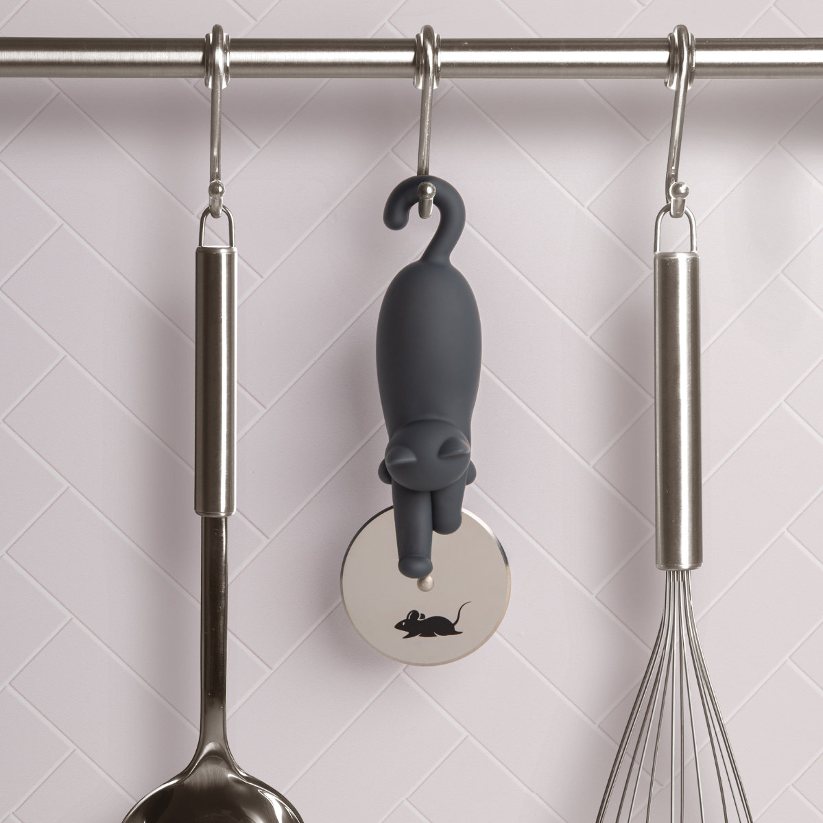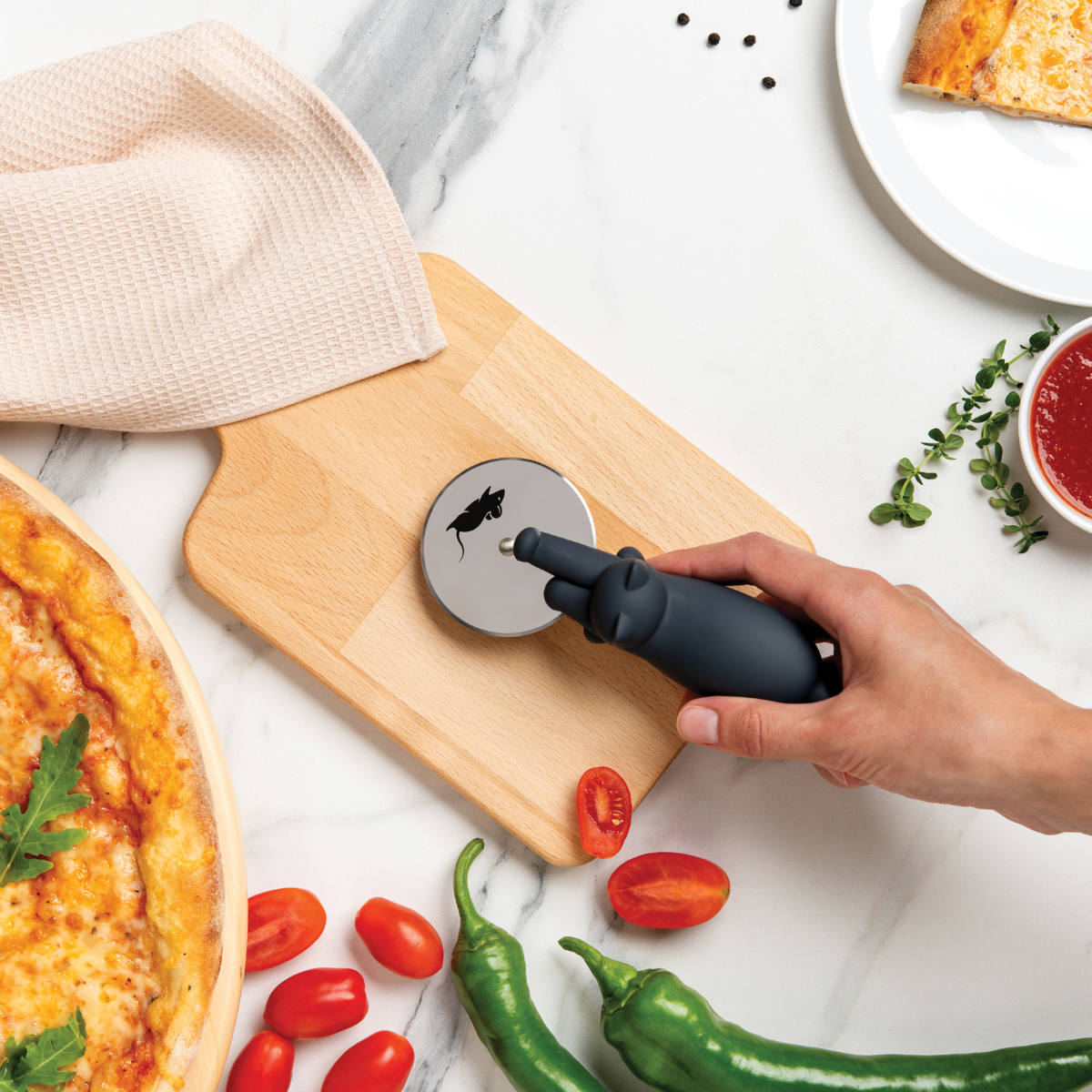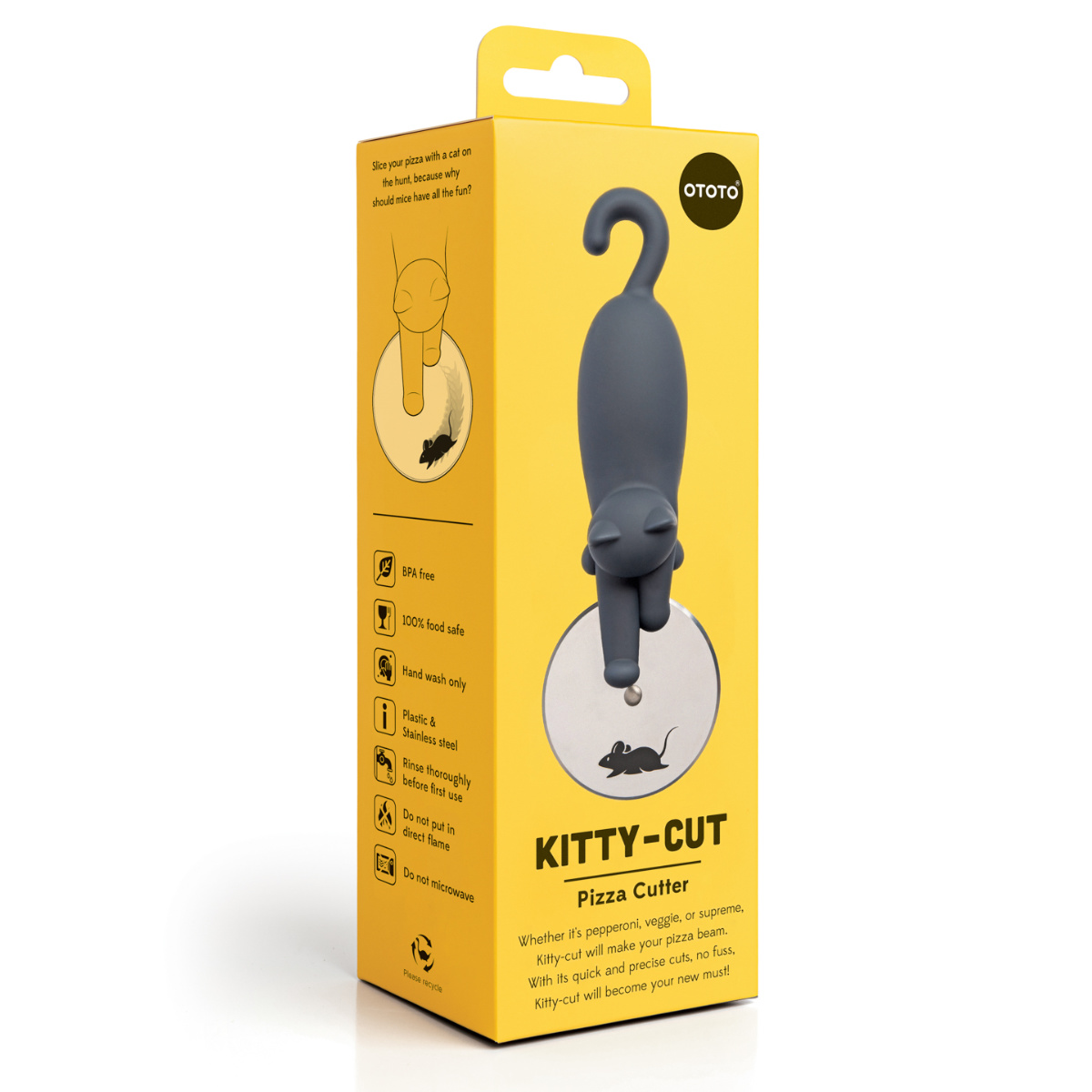 カッター部分にネズミがプリントされており、コロコロ転がすと、まるで追いかけっこをしてるような、とてもユニークな猫のピザカッターです。猫とピザ好きにはたまらない逸品です。