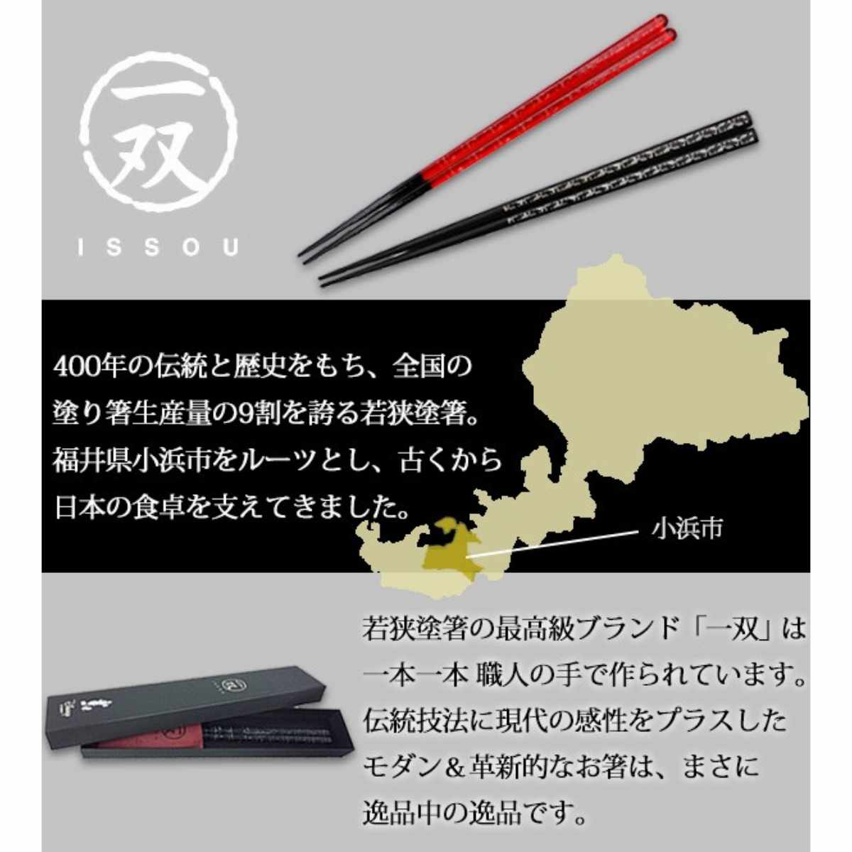 400年の伝統と歴史をもち、全国の塗り箸生産量の9割を誇る若狭塗箸。福井県小浜市をルーツとし、古くから日本の食卓を支えてきました。若狭塗箸の最高級ブランド「一双」は一本一本職人の手で作られています。伝統技法に現代の感性をプラスしたモダン&革新的なお箸は、まさに逸品中の逸品です。