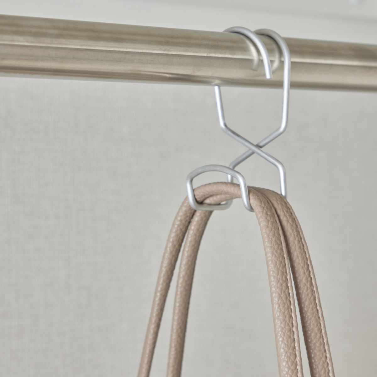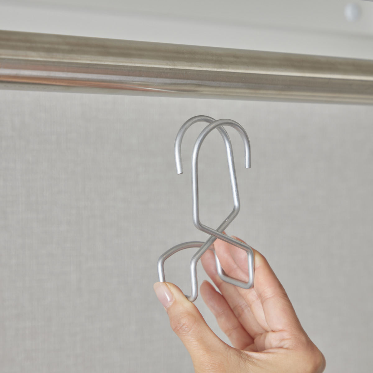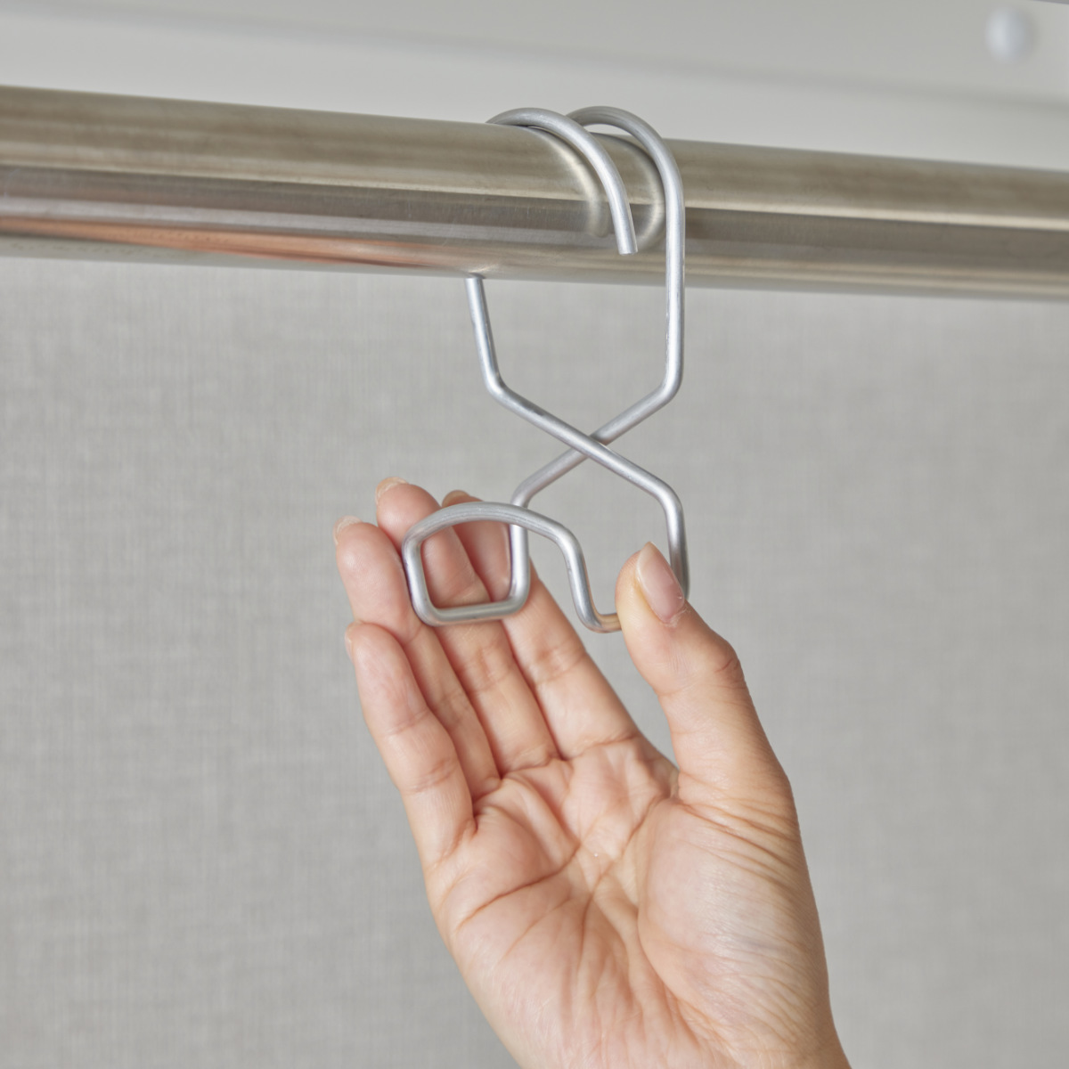 ハンガーパイプを挟み込むだけで簡単に設置できます。特殊なダブルフックで、ハンガーパイプから外れません。