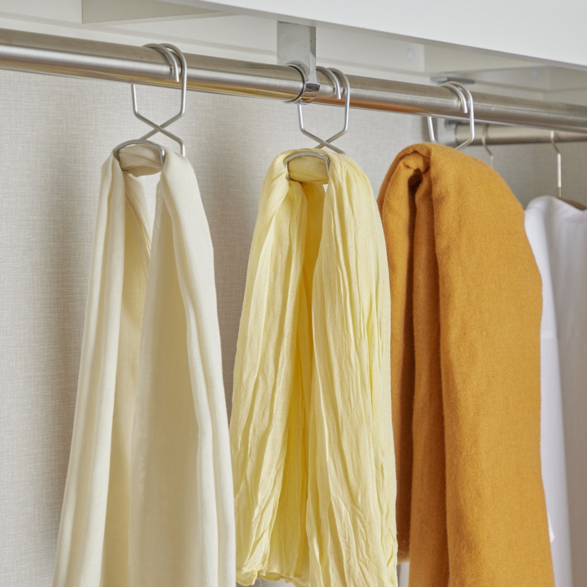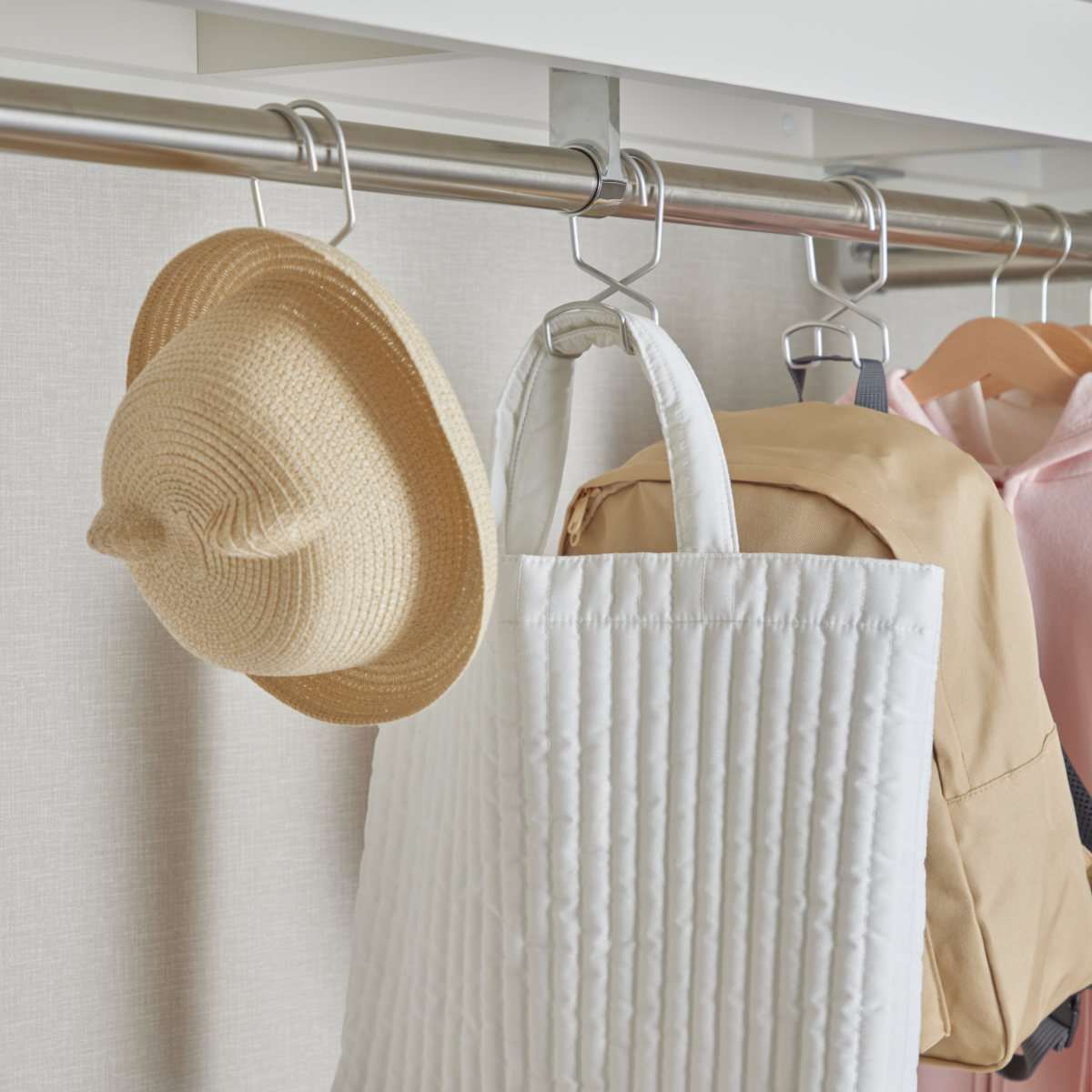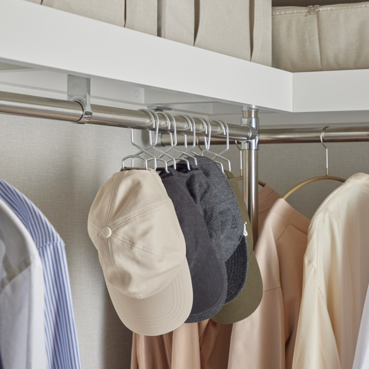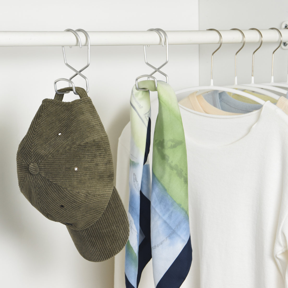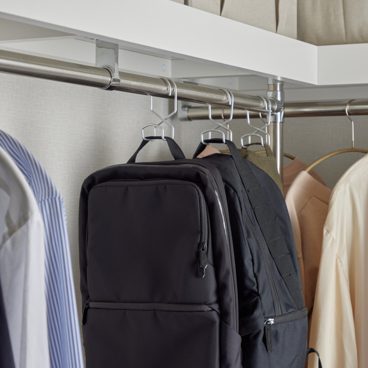 かばんや帽子をハンガーと同じ向きに掛けられます。限られた収納スペースを有効活用できて、見た目もスッキリします。