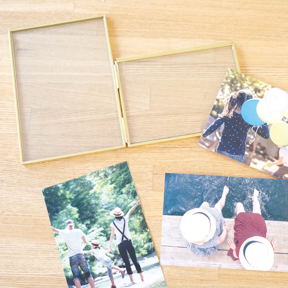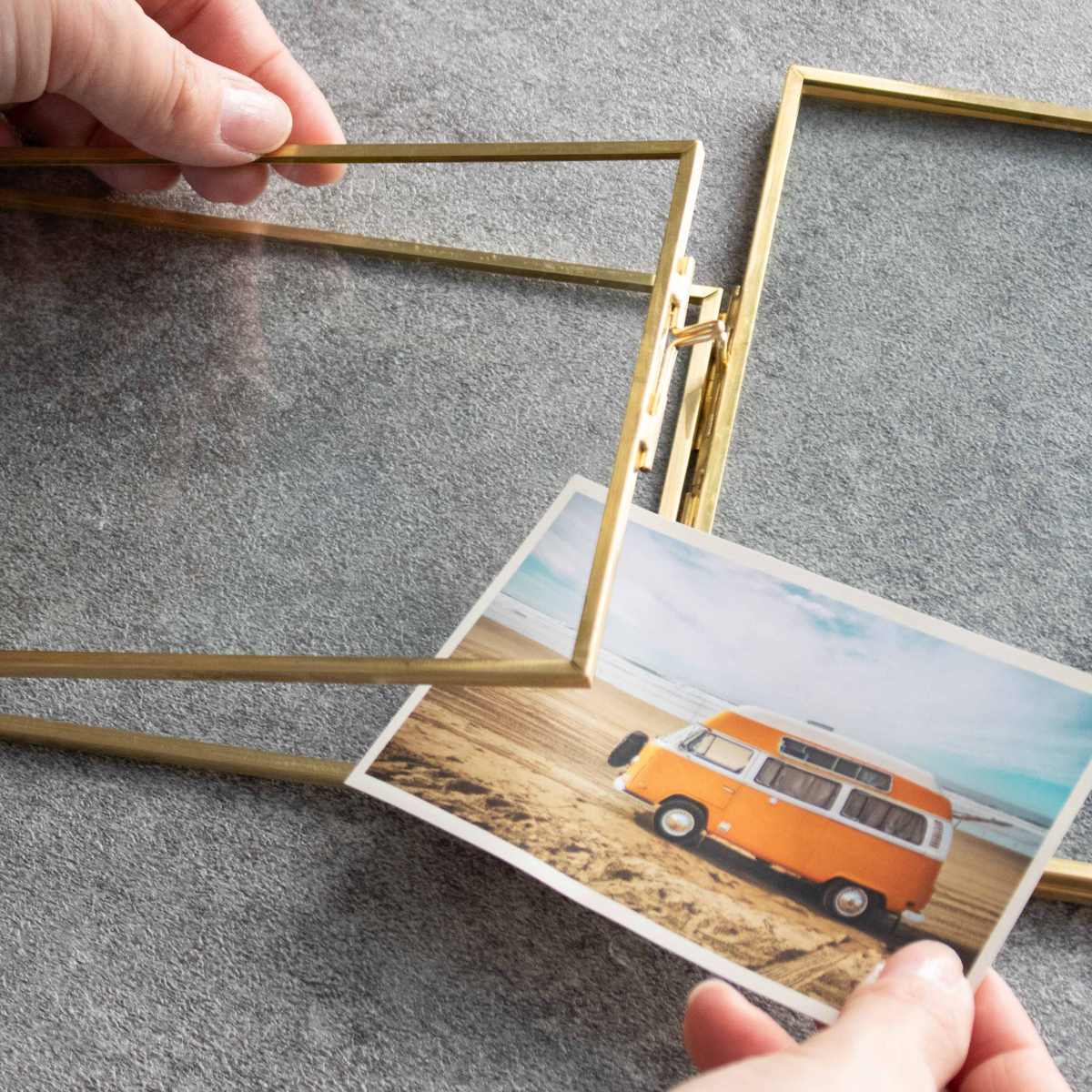 サイドのロックを外して開け閉めできます。2枚のガラスで写真を挟んで飾ってください。
