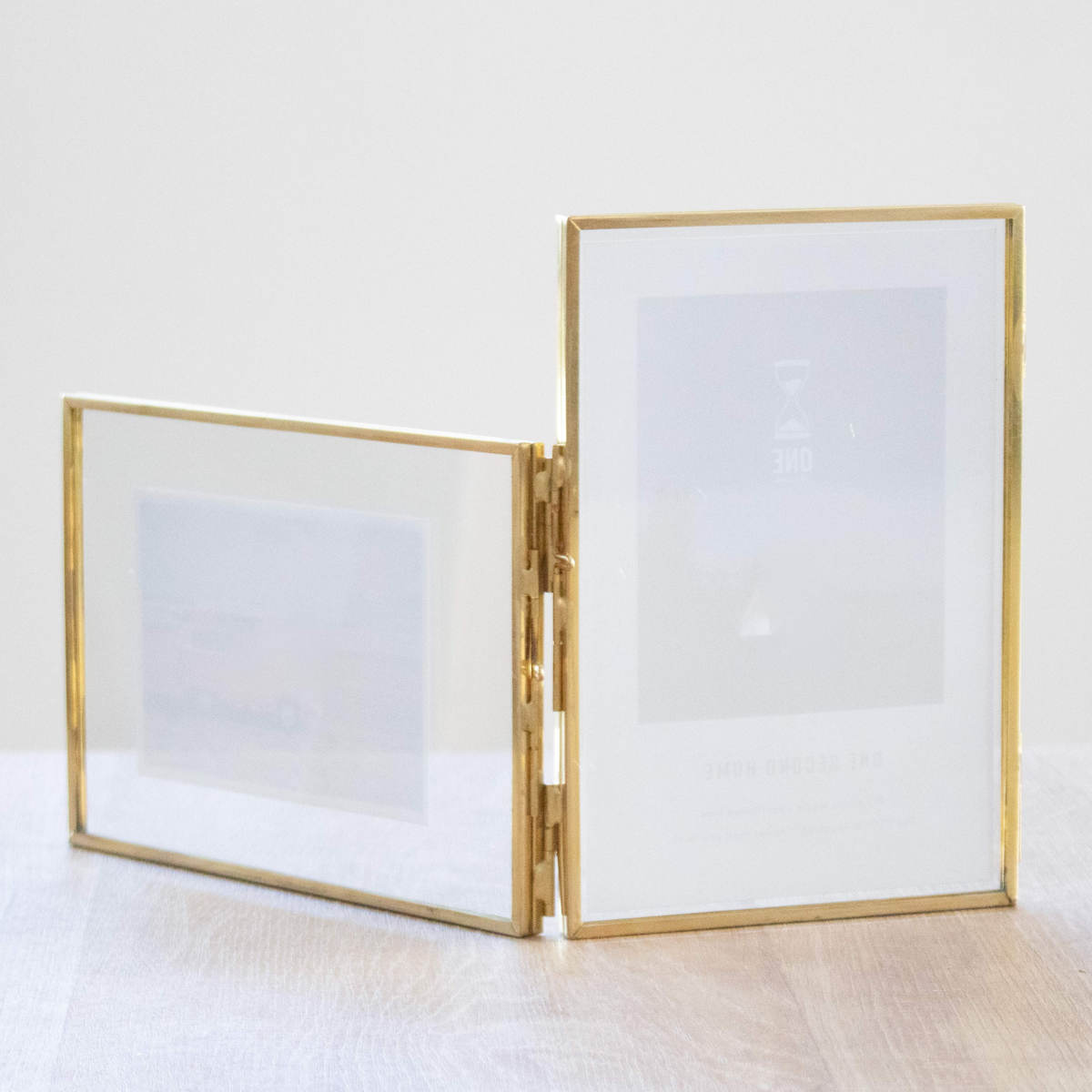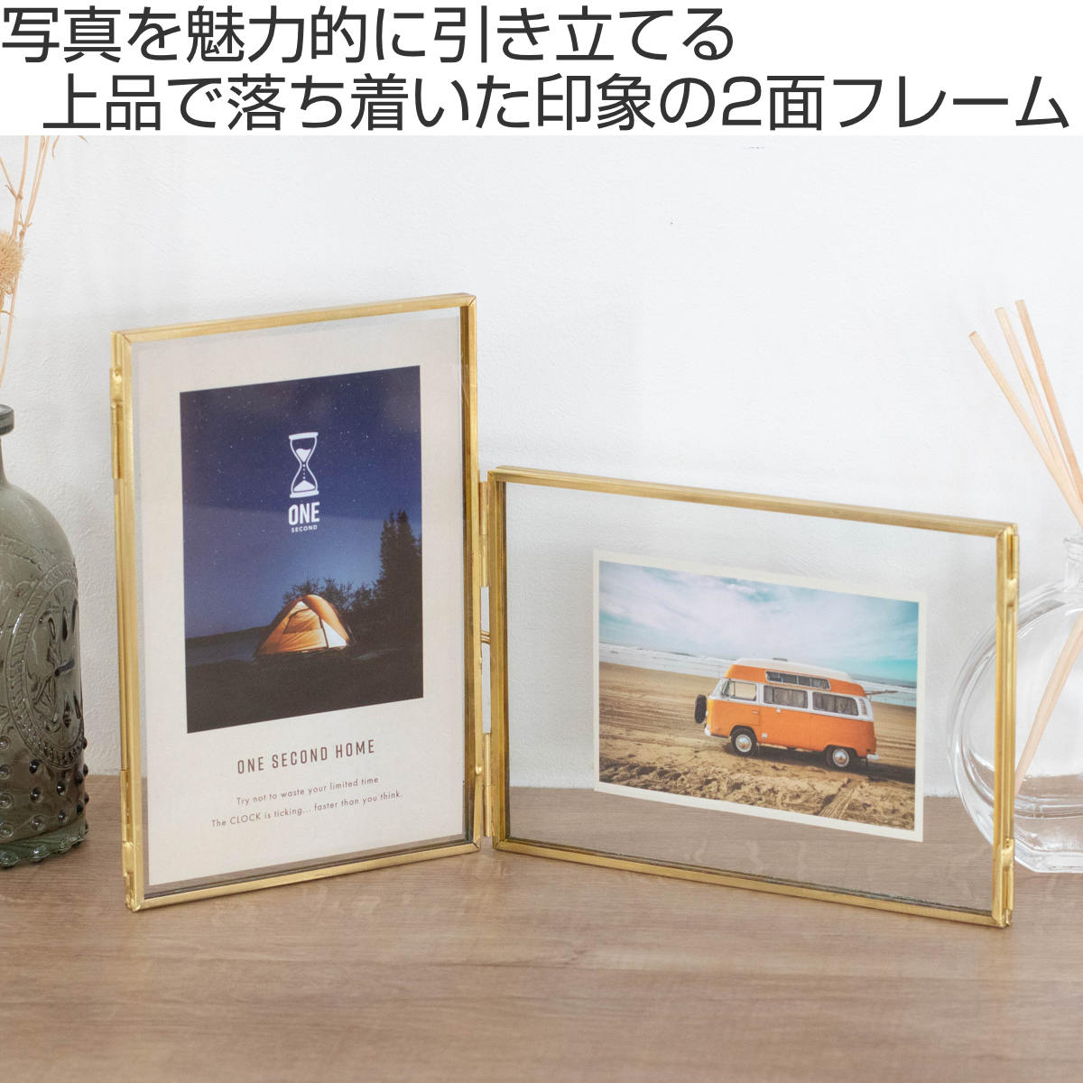 フォトフレーム マルチフェイス メタルフレーム ハガキ判 2連 ( フォトスタンド 2枚 写真立て 写真たて おしゃれ 卓上 壁掛け 置き型 スタンド ガラス 写真 押し花 フレーム ゴールド シンプル ハンドメイド 記念写真 成長記録 )