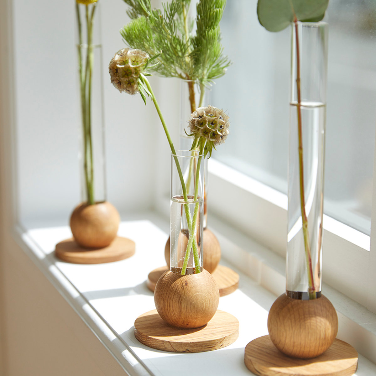 天然木ならではの優しい木のぬくもりと、無機質なガラスシリンダーが軽やかでスタイリッシュな一輪挿しです。生花はもちろん、ドライフラワーやグリーンを一輪活けるだけで誰でも簡単におしゃれに花を飾れます。