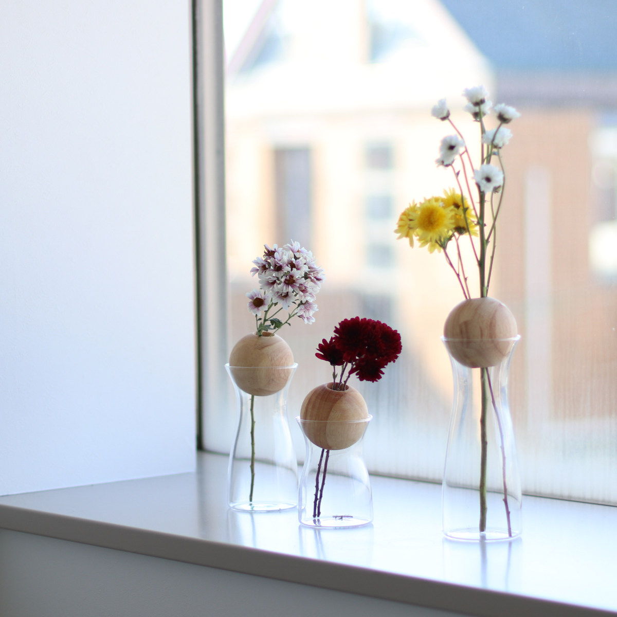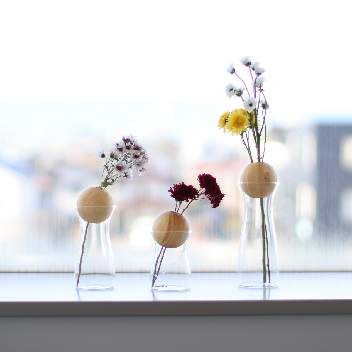天然木のボールとガラスの異素材を組み合わせたカジュアルな一輪挿しです。シンプルなガラスに、ころんと乗った木のボールは取り外しができ、ボールを付けたり外したり、ブーケをいけたり一輪挿しにしたりと、何通りもディスプレイが楽しめるので、花をいける楽しさを存分に味わえます。