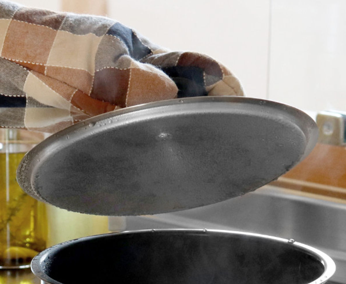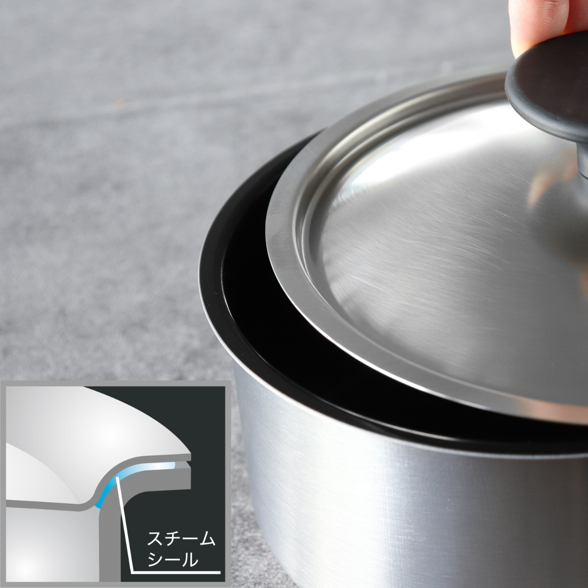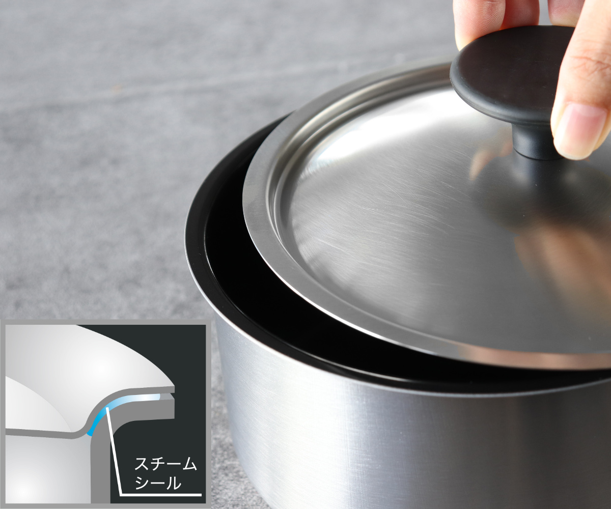 加熱により食材から出た水分が、本体と蓋のあわせ目に入って水蒸気の膜(スチームシール)として形成され、内部を高温で定圧な状態に保ちます。野菜など少ない水分を加えるだけで、素材のうま味や風味を逃さずに調理することができます。