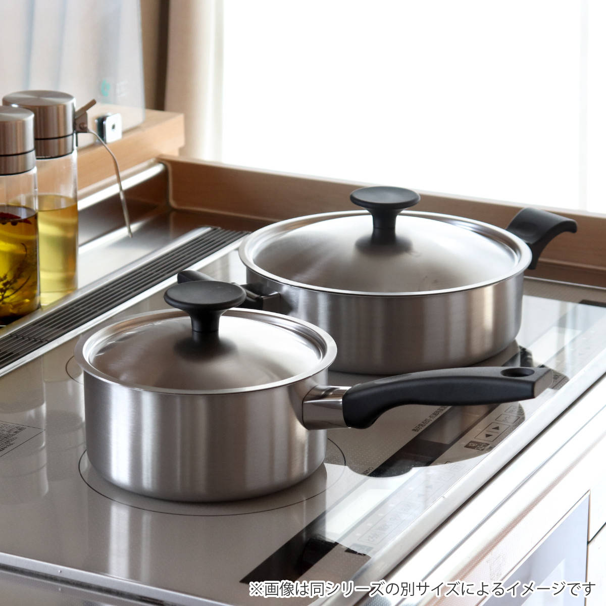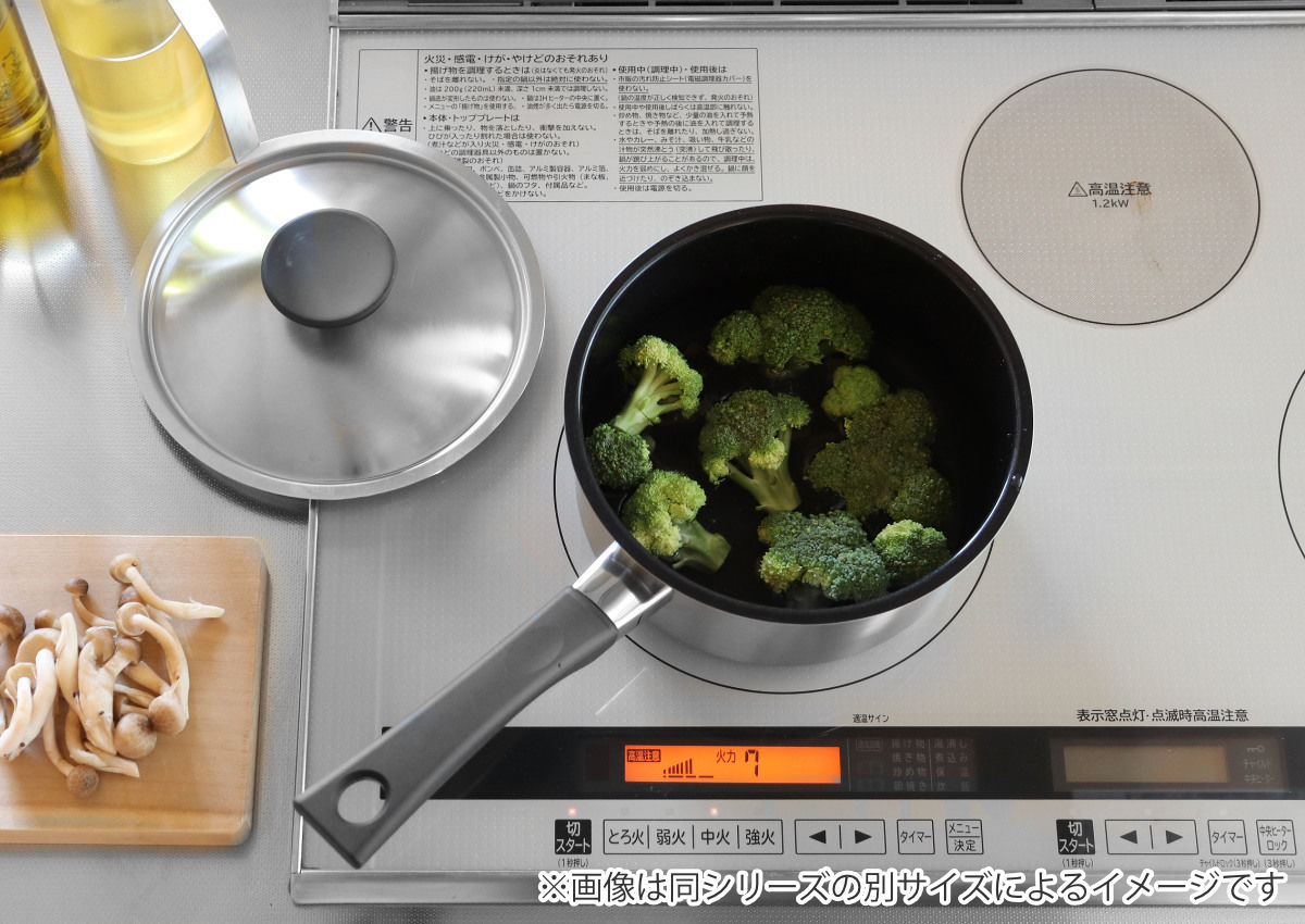 蓄熱性の高いステンレスと優れた熱伝導性のアルミニウムの全面3層構造の片手鍋です。熱効率の良い3層構造の素材を全面に使うことで、底面だけでなく側面にも熱が伝わり、ムラなく加熱します。食材に熱が均一に伝わるので、おいしく調理することができます。