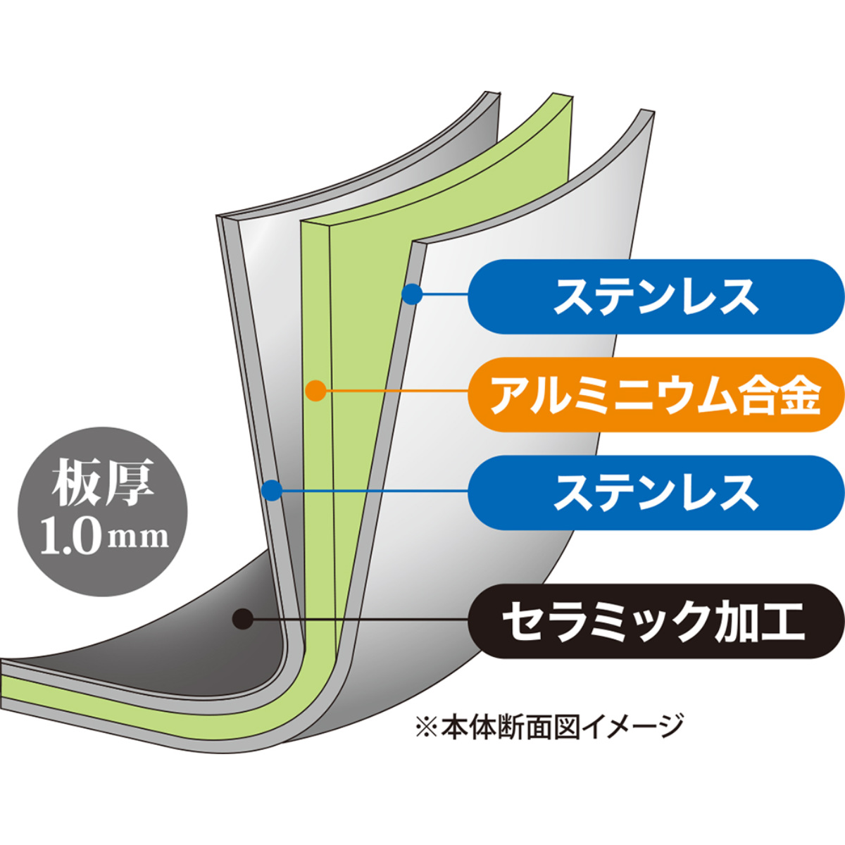 全面3層構造に加えて、内面には熱に強いセラミック加工が施されています。食材がこびりつきにくく、さっと流すだけでキレイになるのでお手入れも簡単です。