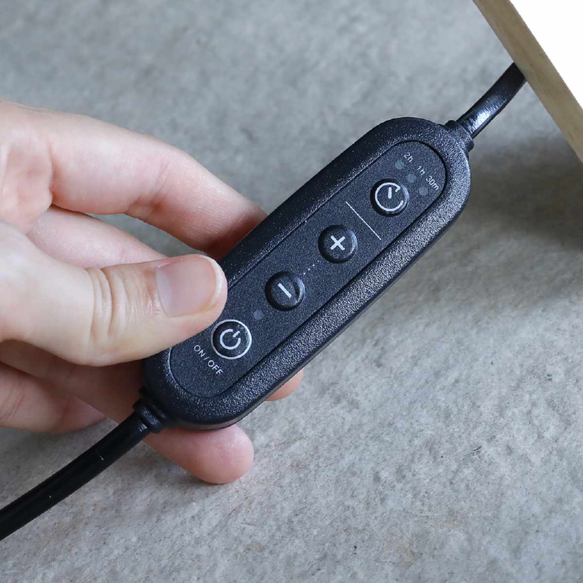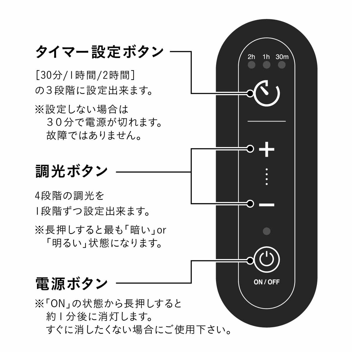 30分/1時間/2時間の3段階でタイマー設定ができます。設定しない場合は30分で電源が切れるので、つけっぱなしのままにすることがなく安心してお使いいただけます。