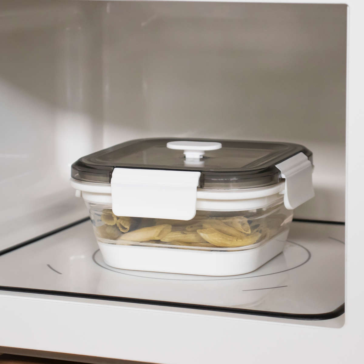 折りたためる角型500mlの保存容器です。冷凍・電子レンジに対応し、下ごしらえから保存、加熱までこれひとつで完結します。透明デザインで中身が一目でわかり、管理もしやすいのが特徴です。