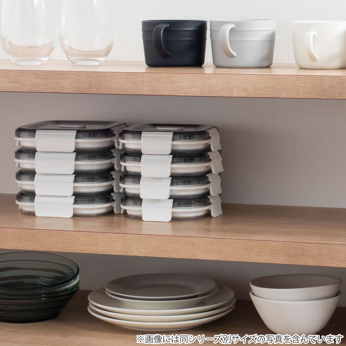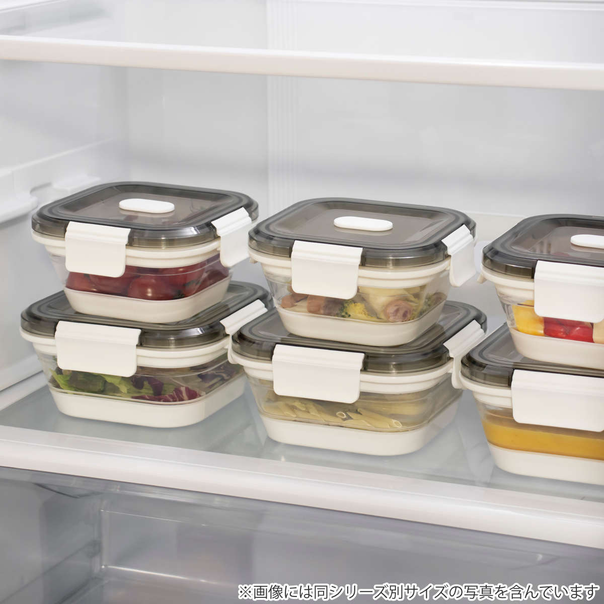 冷凍から冷蔵まで幅広く使えるアイテムで、作り置きにも便利です。本体もフタも透明なので中身が一目でわかり、冷蔵庫での管理もしやすくなります。重ねて収納して、キッチンや冷蔵庫内をすっきり整えられます。