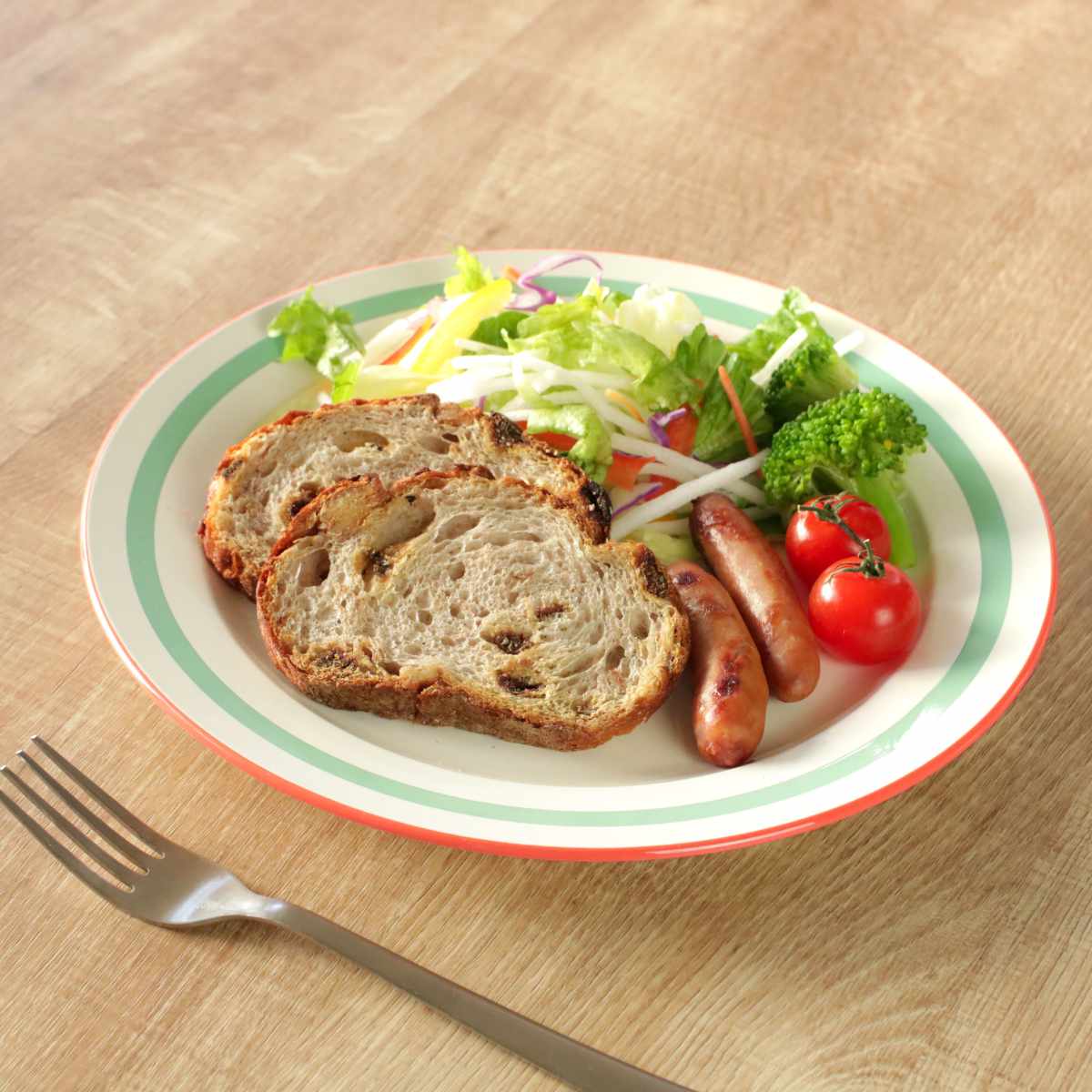 少し懐かしさを感じるレトロなデザインです。直径約24cmで、パスタやオムライス、パンにサラダとウインナーなどを添えて朝食のワンプレートにもピッタリ。