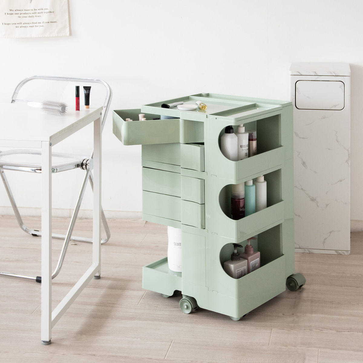 高さ74cmで、デスクサイドにぴったりのサイズ感。ネイルサロンで道具を整理するワゴンとしてや、ドレッサーとしてもちょうど良い高さです。収納スペースが豊富なので、家中のいろいろな場所での整理整頓にぴったりです。