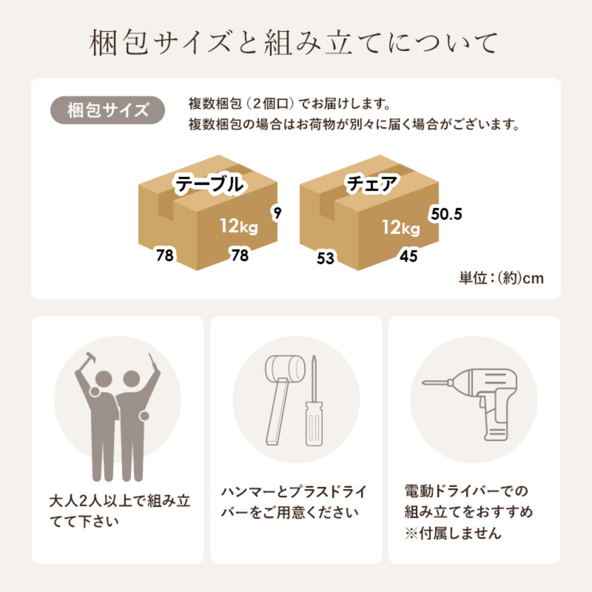 | サイズ | テーブル:約 幅75×奥行75×高さ70(cm) チェア:約 幅48.5×奥行57×高さ86.5(cm) 座面高:約 42(cm) |