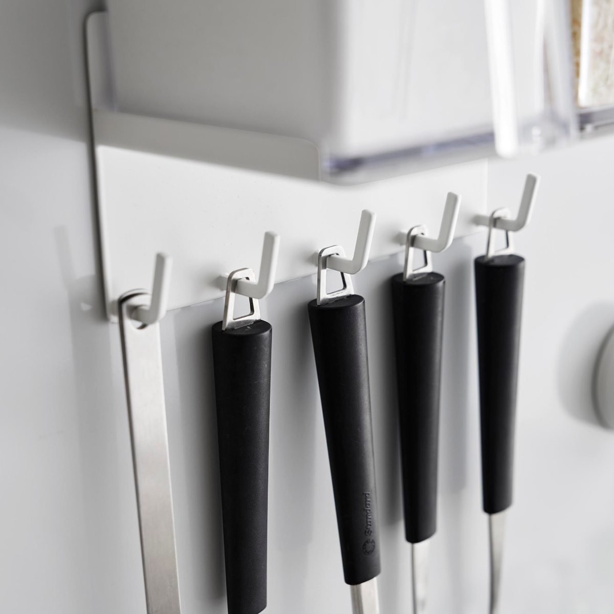5連のフックには、お玉やフライ返しなどの調理器具やミトンなど、キッチンツールを引っ掛けて収納できます。調理中でも片手でサッと取ることができて便利です。