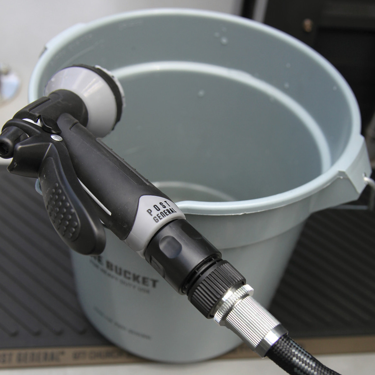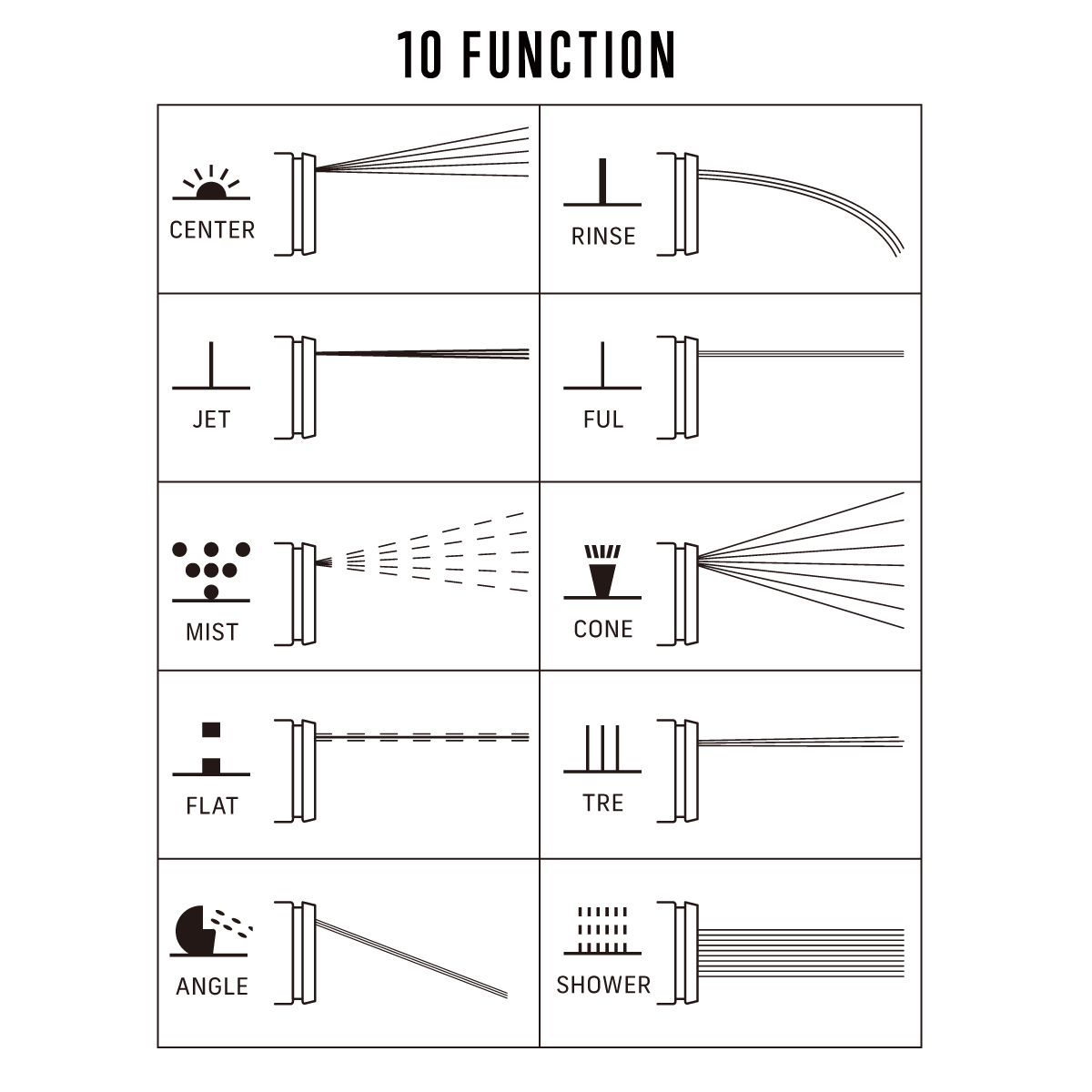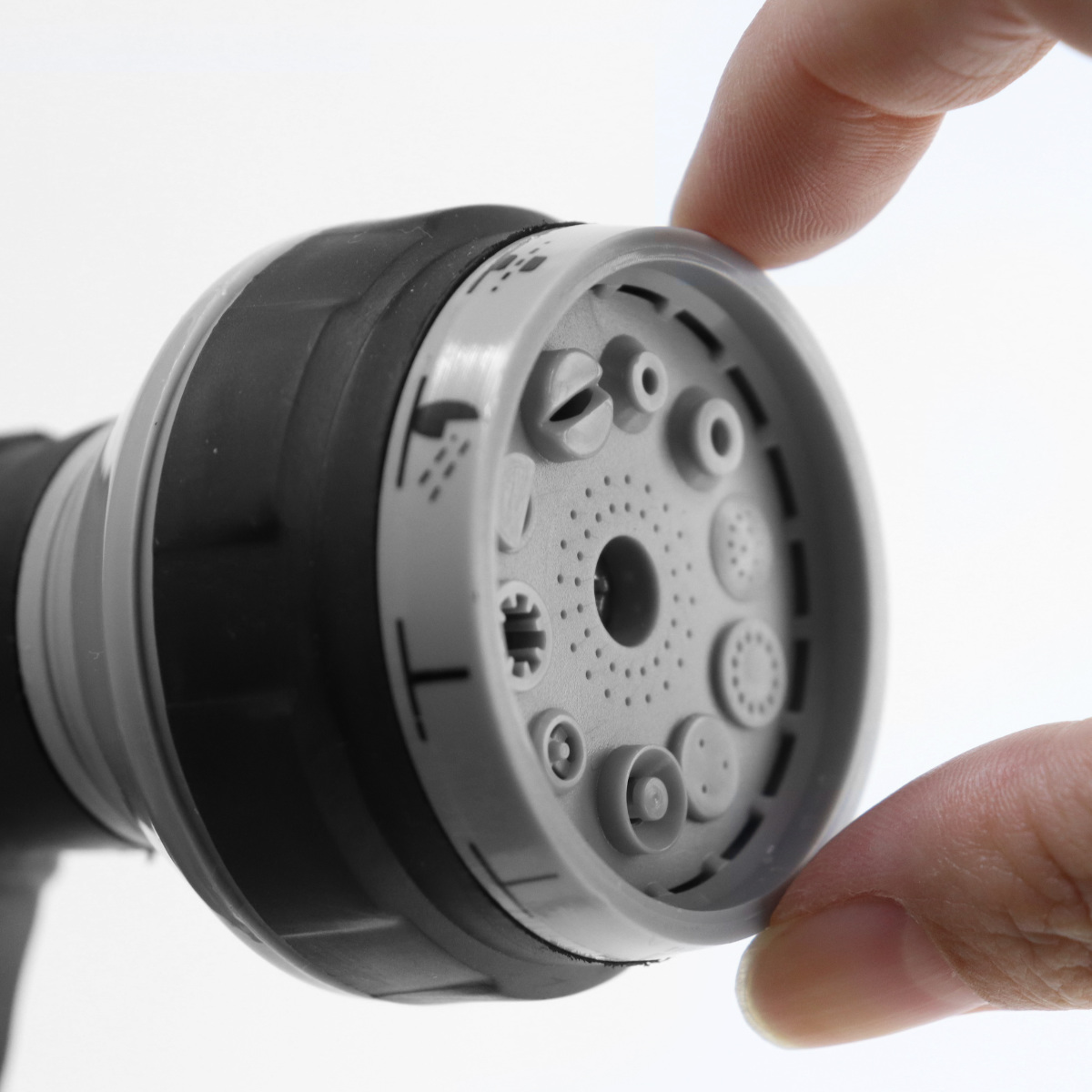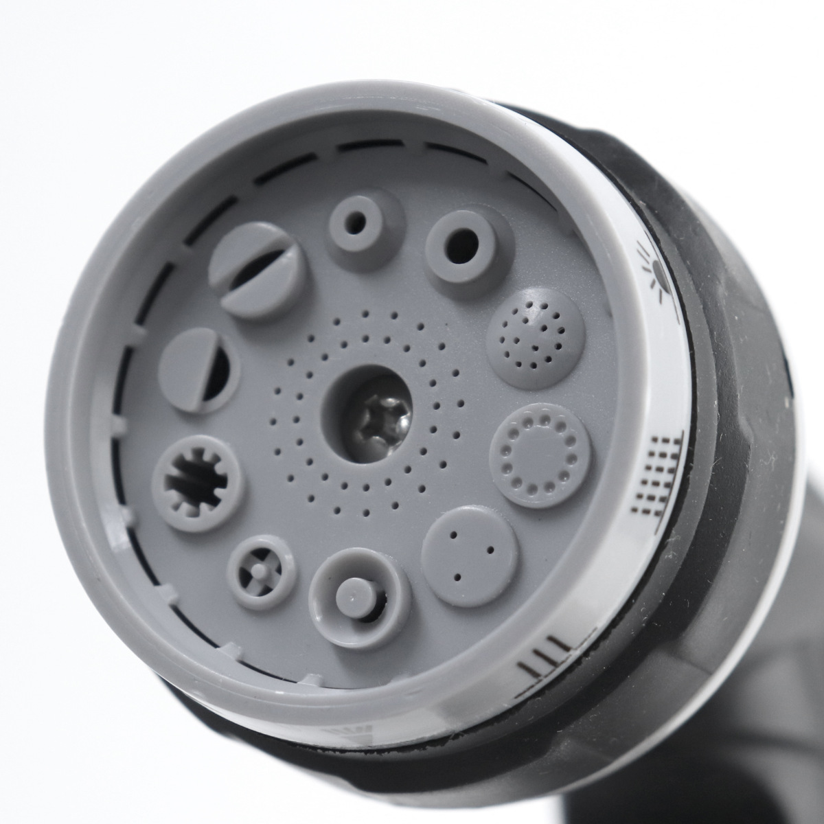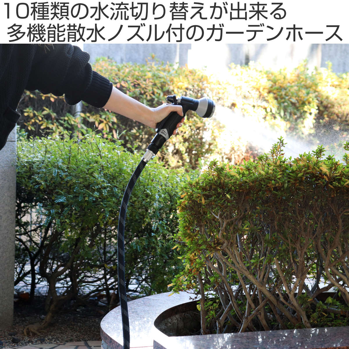 多機能散水ノズル付きのガーデンホースです。ノズルヘッドを回すことで10種類の水流パターンに切りかえることができ、車の洗浄から植物の水やりまで、さまざまなシーンに応じた使い分けが可能です。