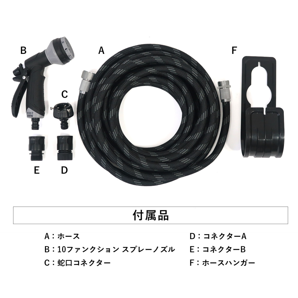 ホース・ノズルの他に、接続コネクター、収納に便利なホースハンガーが付属しています。