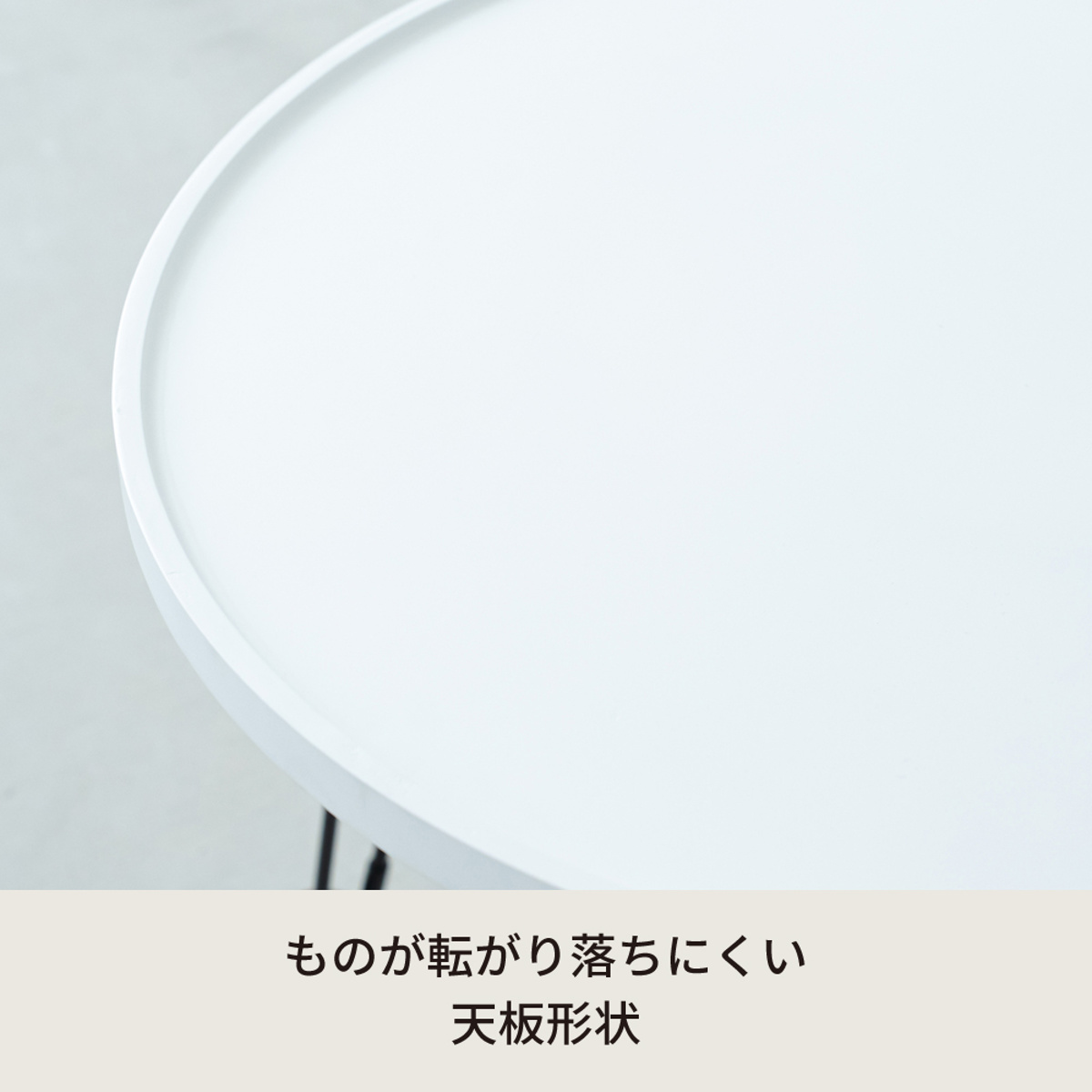 天板のフチは物が転がり落ちにくく実用的な形をしています。雑誌やカップを広げても、ゆったり使い勝手の良い直径60cmで、ソファ・ベッド横に最適です。観葉植物やお気に入りの小物を置く台としても活躍します。