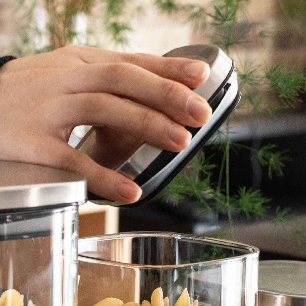 ステンレス製のフタとガラス製の本体がスタイリッシュなキャニスターです。ショートパスタやシリアル、コーヒー豆などの乾物保存に最適です。ガラス製なので保存状態や残量の確認がしやすく、詰替えのタイミングが分かりやすいです。また、においや色移りがしにくく汚れが落ちやすいのも嬉しいポイントです。