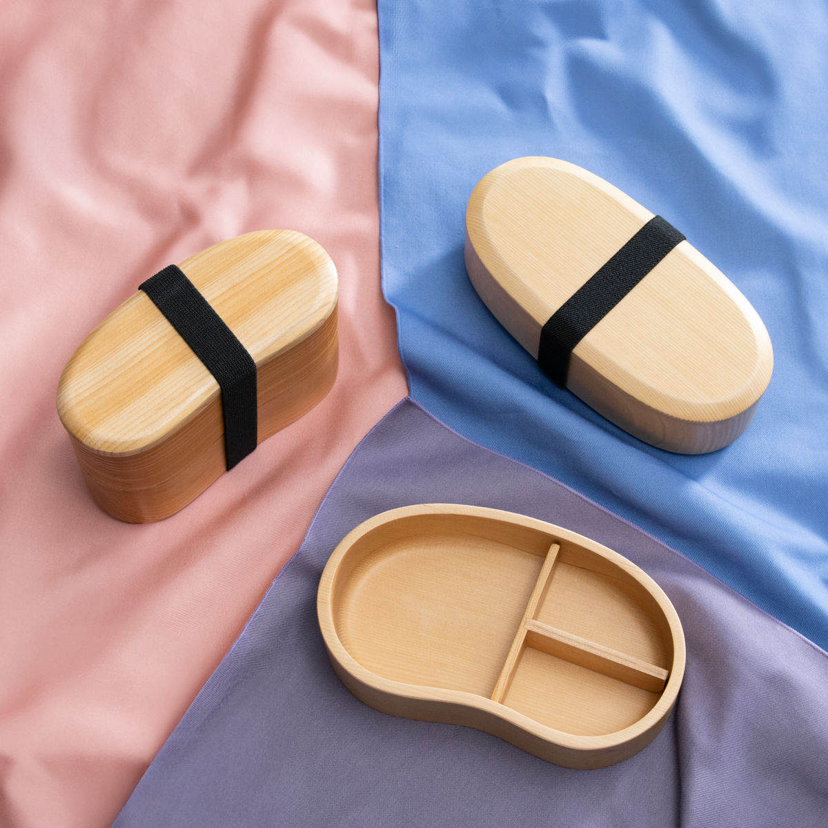 豆型、楕円形、2段など、形違いやサイズ違いで取り揃えております。同じ形でも天然木の風合いで違って見えるのも魅力です。大切な方への贈り物にも、いかがでしょうか。