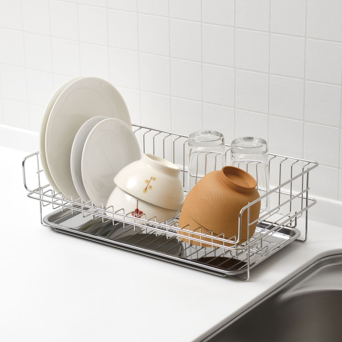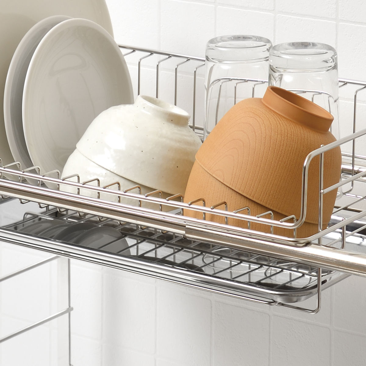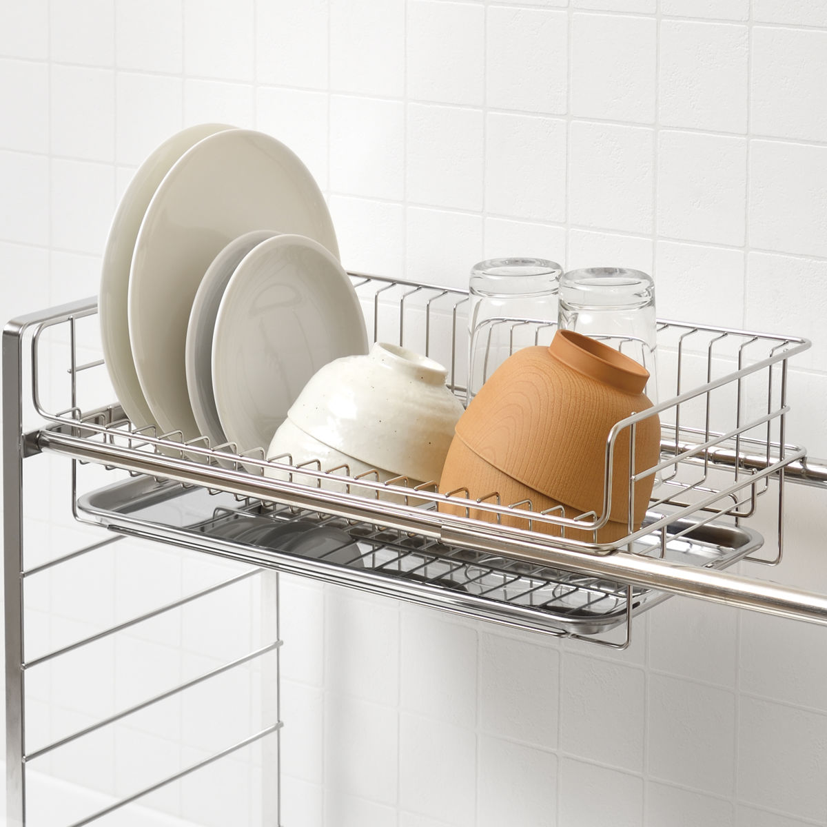 ベースラックと組み合わせて使用するのはもちろん、水切りバスケットのみで使用することもできます。食洗機に入れられない食器類を乾かす、サブ水切りにもおすすめです。
