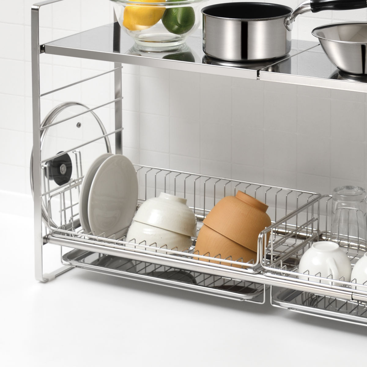 収納スペースや作業スペースが少ないキッチンを使いやすくする「SUIグート」シリーズ。パーツを組み合わせて自分好みのオリジナルスペースを作ることができます。食器やキッチン小物をまとめて水切り・収納することで家事の時短に繋がります。