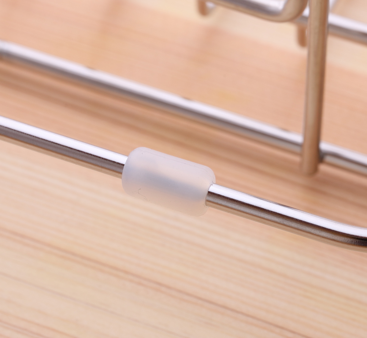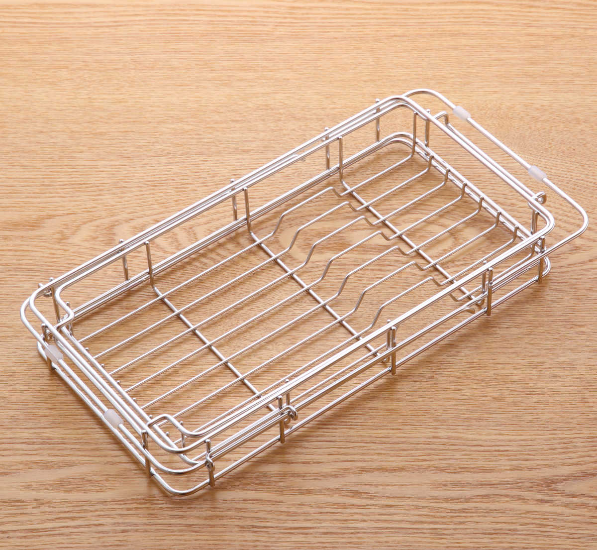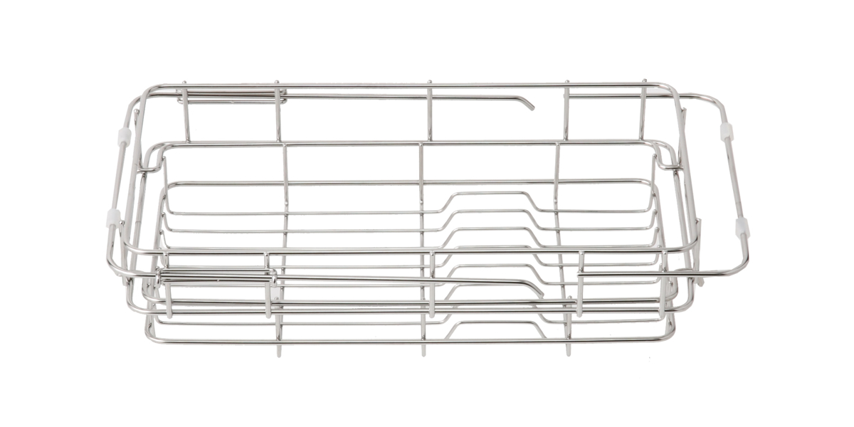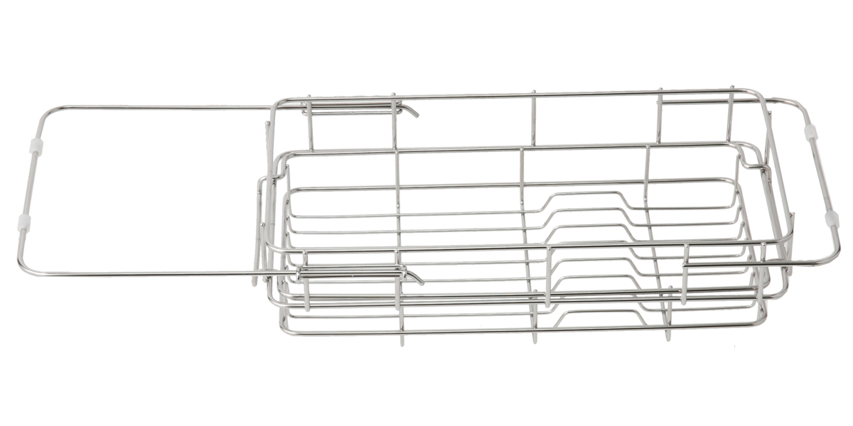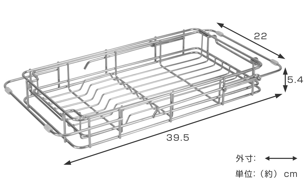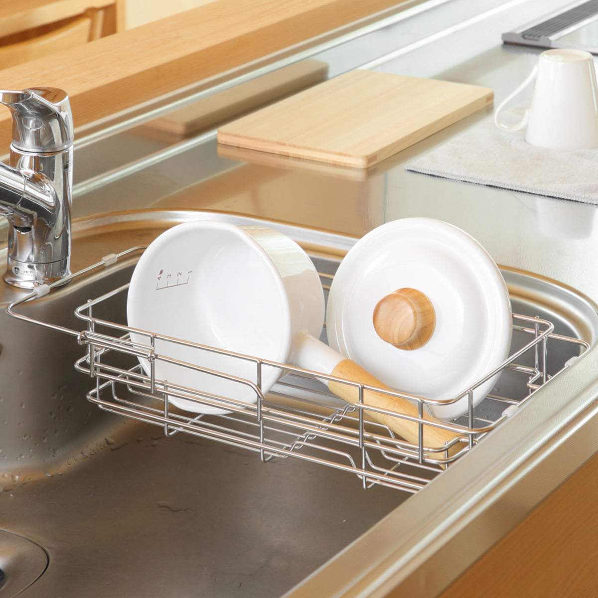 サビにくくて丈夫なステンレス製です。カゴ部分は汚れの溜まりやすいワイヤーの交差が少ないので、洗いやすくいつでも清潔にお使いいただけます。また、すべり止めがついているのでシンクからずれ落ちにくくなっています。