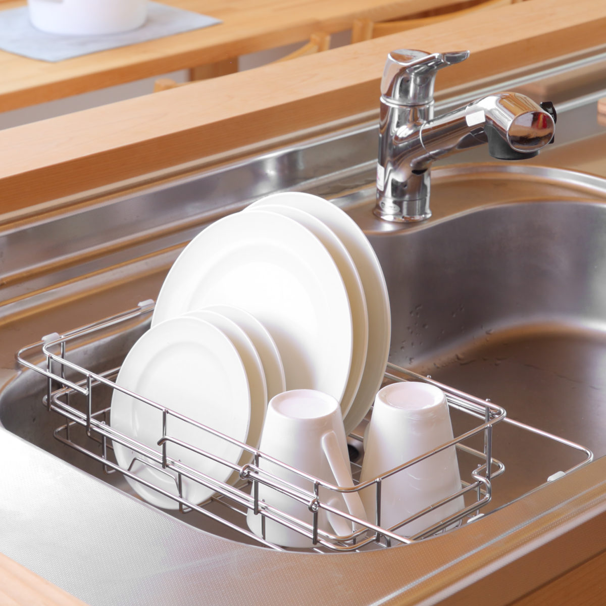 天板の上に水切りカゴを置くと作業スペースの広さが気になる方におすすめの水切りバスケットです。直接シンクに掛けて使用するので、天板上の作業スペースを確保することができます。