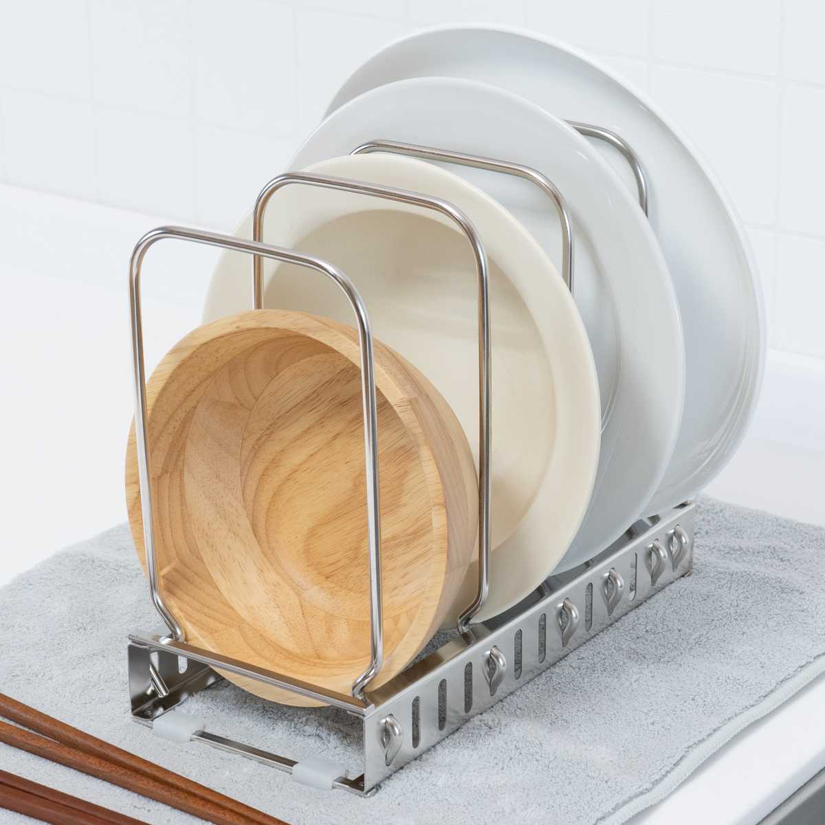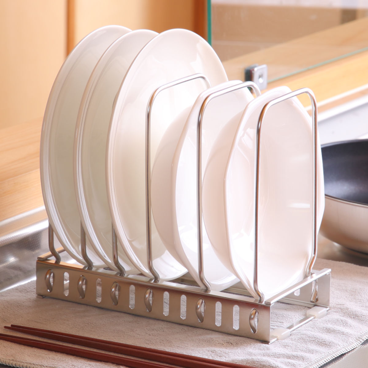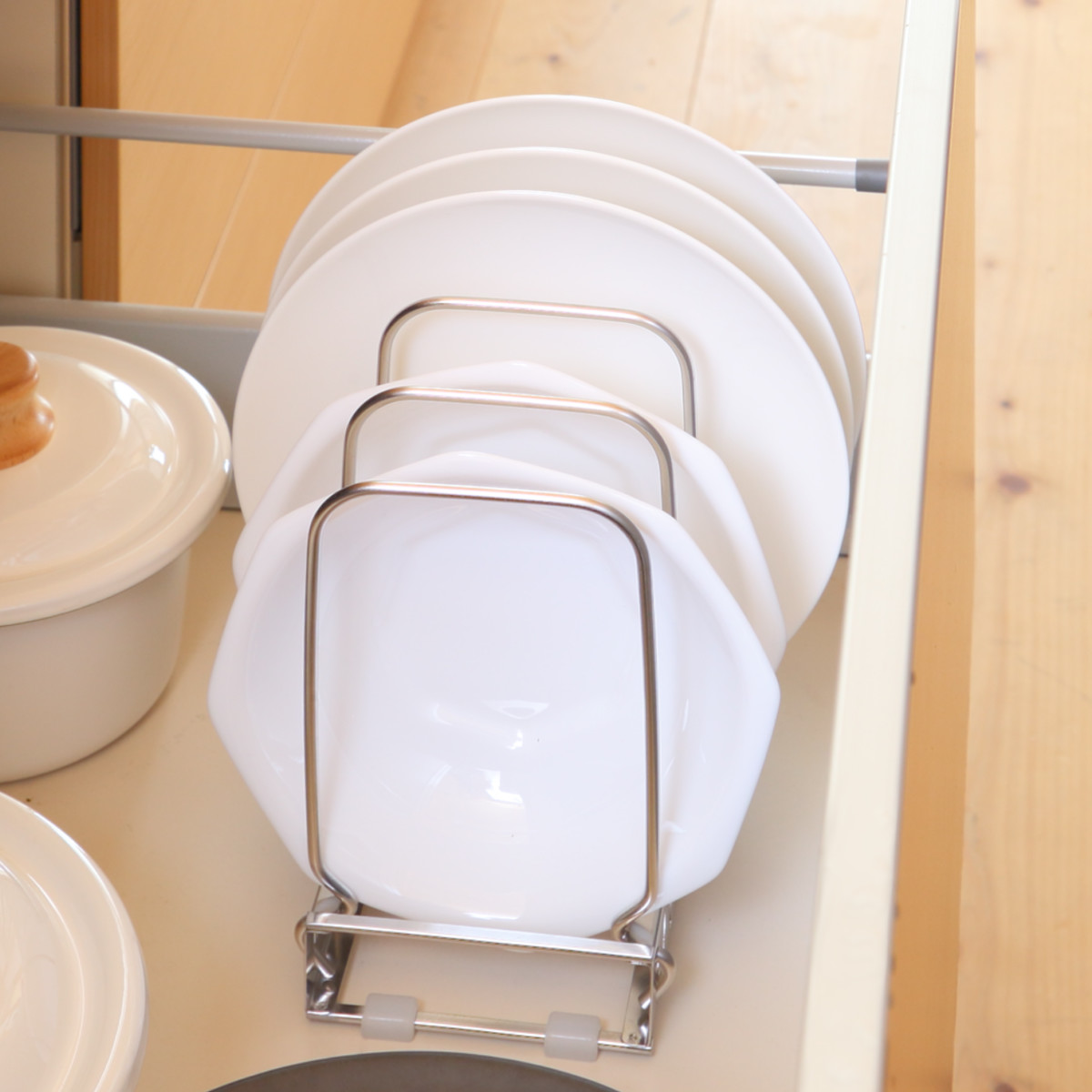 お皿や器に合わせて、幅調節が可能です。重ねて収納するよりも見やすく、取り出しやすいです。