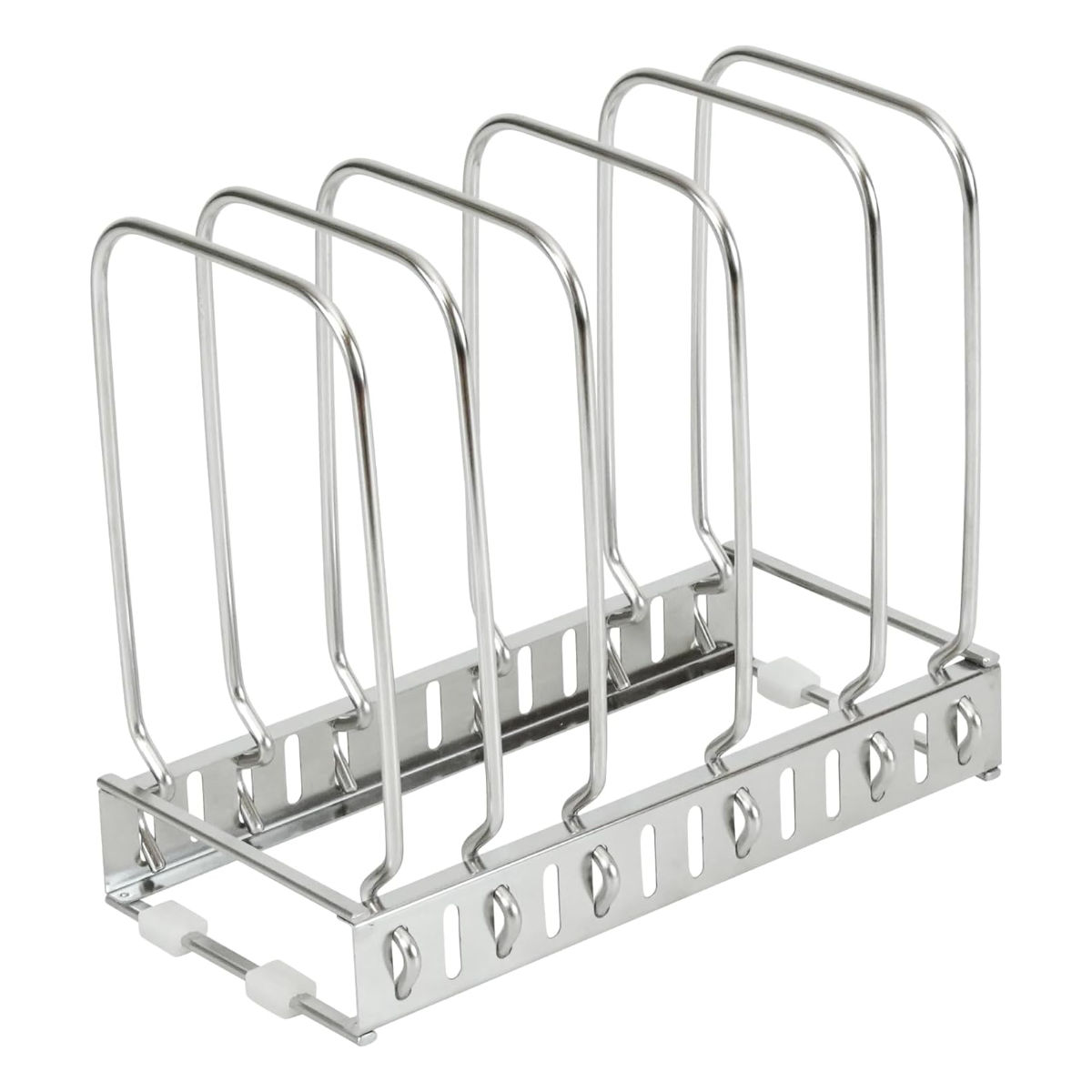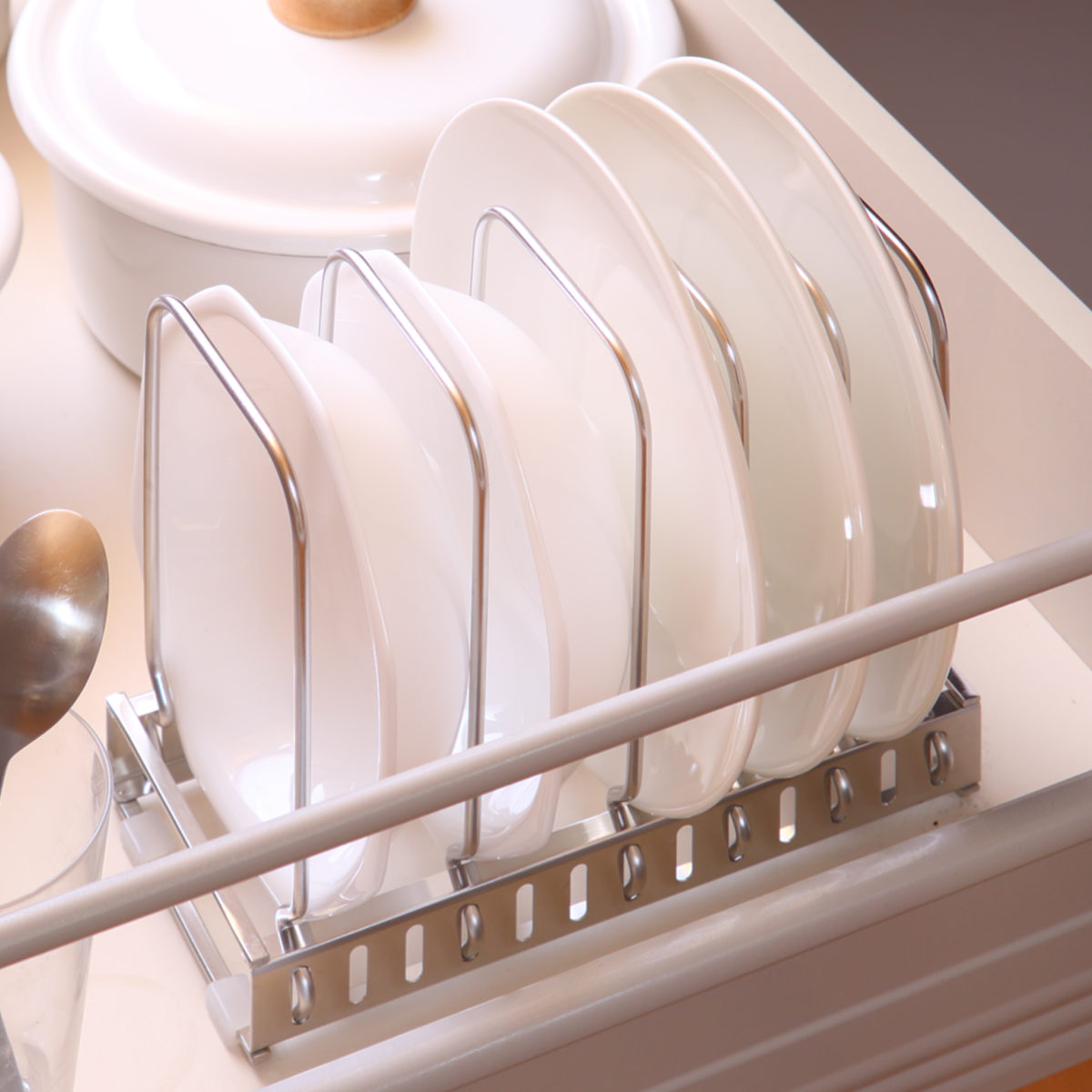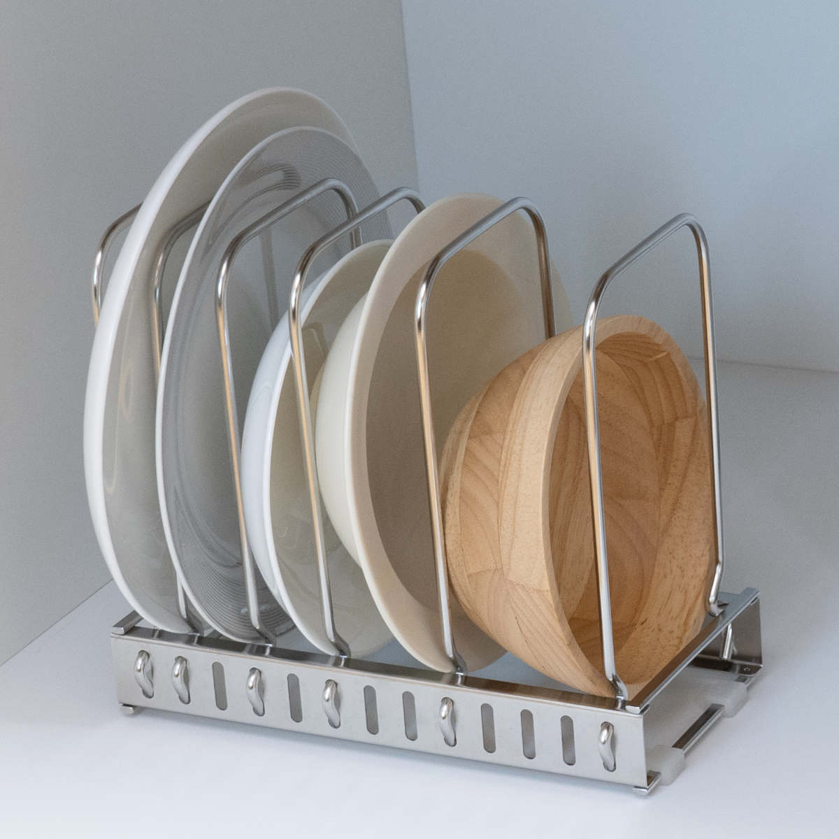 お皿や器に合わせて、幅調節が可能です。重ねて収納するよりも見やすく、取り出しやすいです。